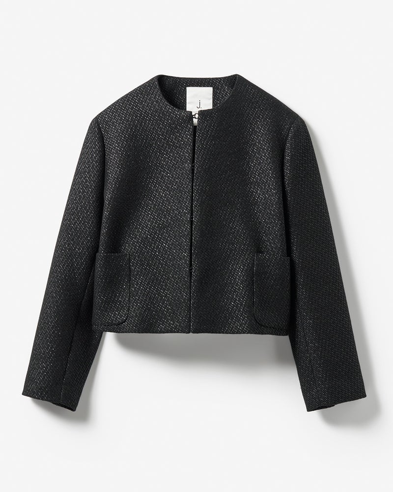 上半身をすっきりコンパクトに魅せる美シルエットのノーカラージャケットは、オフィスやお出かけに欠かせない大人の定番アイテム。ボタンなしの究極にミニマムなデザインだからこそ、j.ならではの立体裁断の技術が映える1着。異なる複数の糸を用いたドビー織りならではのテクスチャ感がシンプルスタイルに華を添えます。セットアップにもできる同素材のワンピース(品番:14439 ドビーツイード・ワンピース)もご用意しました。