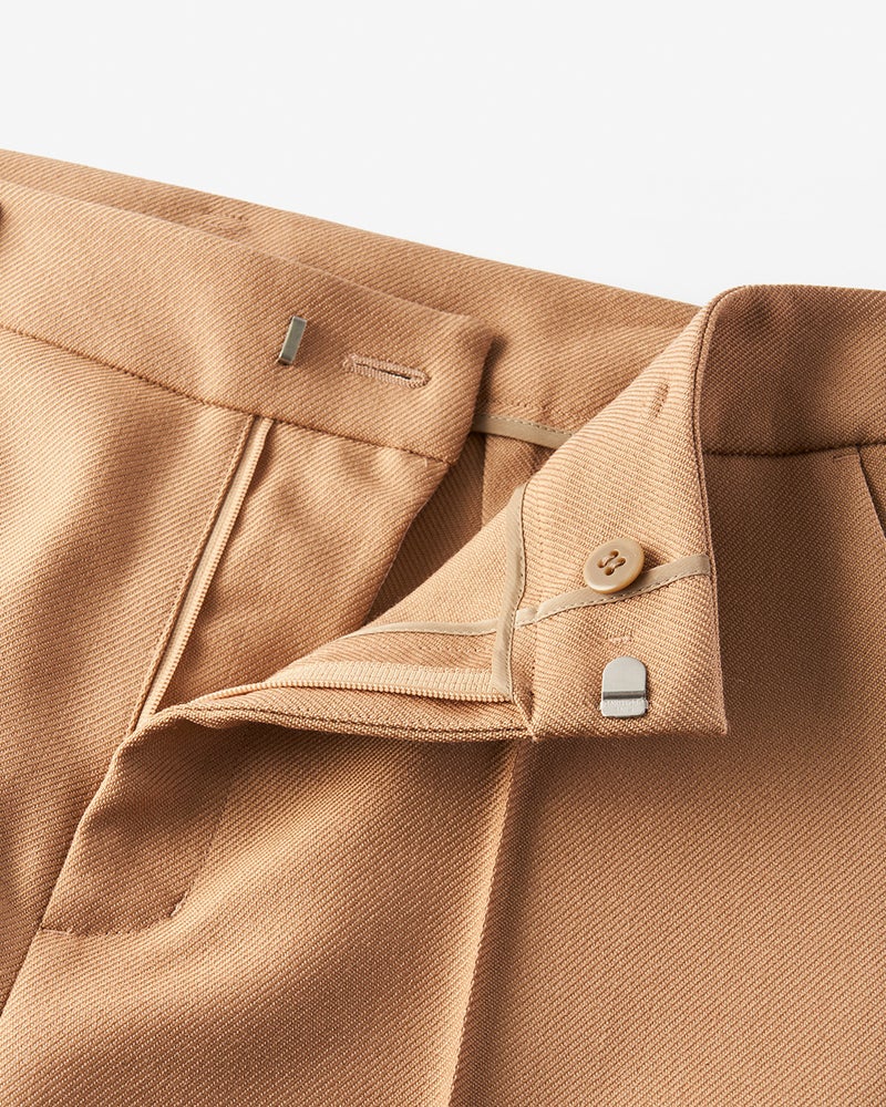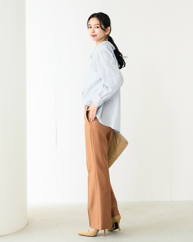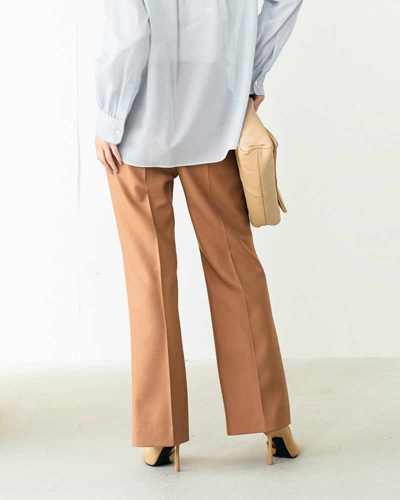 下半身の余分な凹凸やゆがみをまっすぐに整えてくれる、スマートフレアパンツ。太すぎない上品な筒幅や膝をわずかに絞ったシルエット、ウエストはヒップが美しく見えるよう後ろを少し高めに設定するなど、j.ならではの立体裁断が存分に生かされた大人を綺麗に見せるシルエットが特長です。ドライな質感にこだわったヴァージンウールMIX素材は、秋から春までロングシーズン活躍する優秀素材。