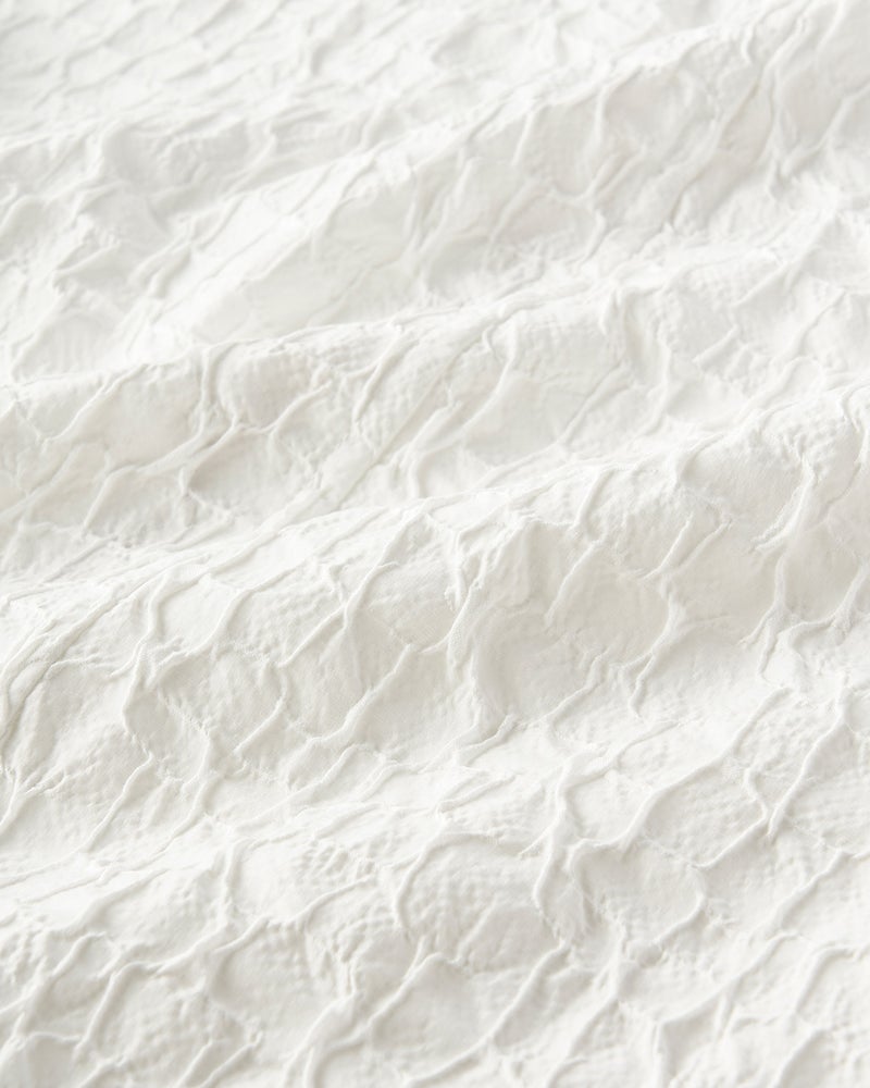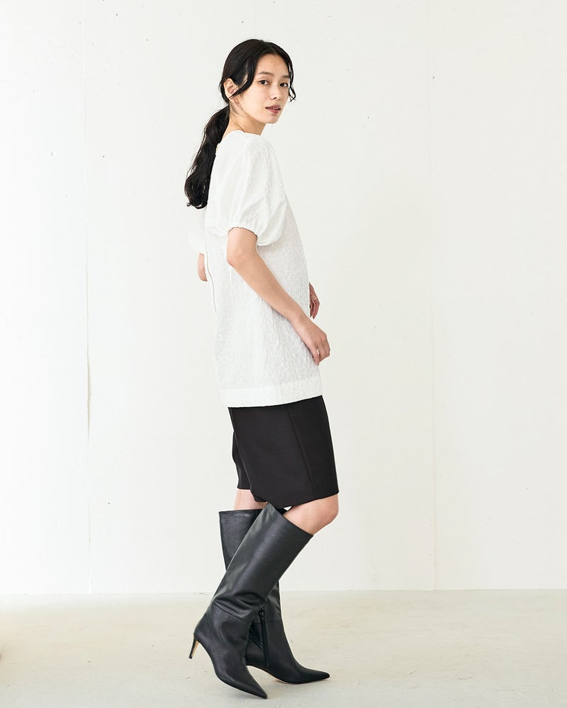 表面がポコポコと浮き上がる独特のテクスチャーを持つ「ふくれジャカード」。j.オリジナルのフェミニンな素材を使って、華やかなバルーンスリーブのブラウスに仕立てました。袖口を引き絞れるリボンも可愛いアクセントに。秋口のカジュアルを華やかにしてくれる1着です。