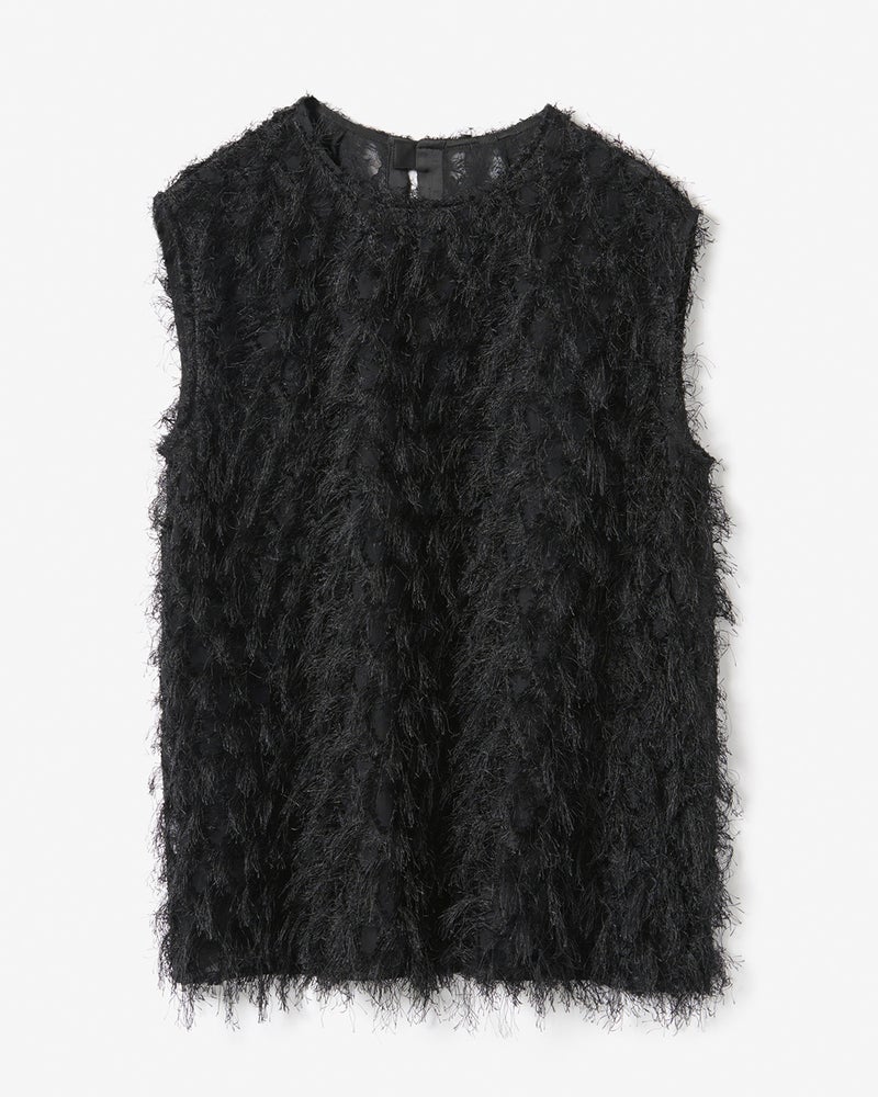 シンプルなスリーブレスのブラウスも、テクスチャーを味方につければパーティやお出かけに似合う1点映えアイテムに。毛足の長い糸をアーガイル模様のジャカード織りで仕上げた素材は、伝統と革新が共存するテキスタイル産地、群馬・桐生産。モヘアのようなエアリーな透け感が秋冬の着こなしのアクセントに。