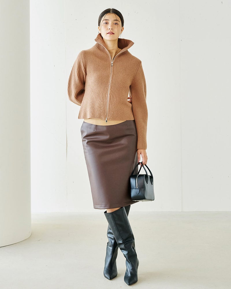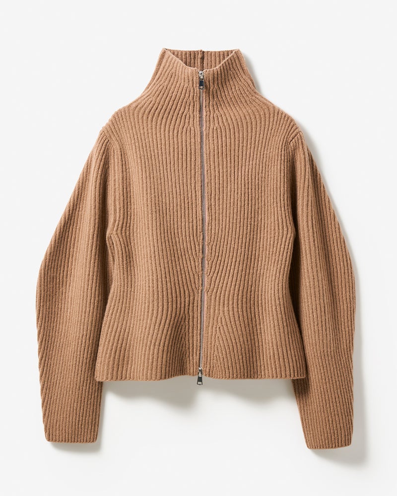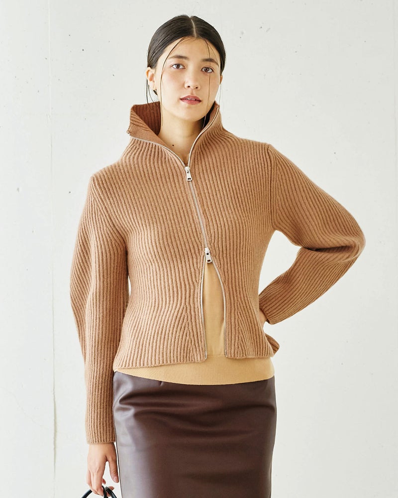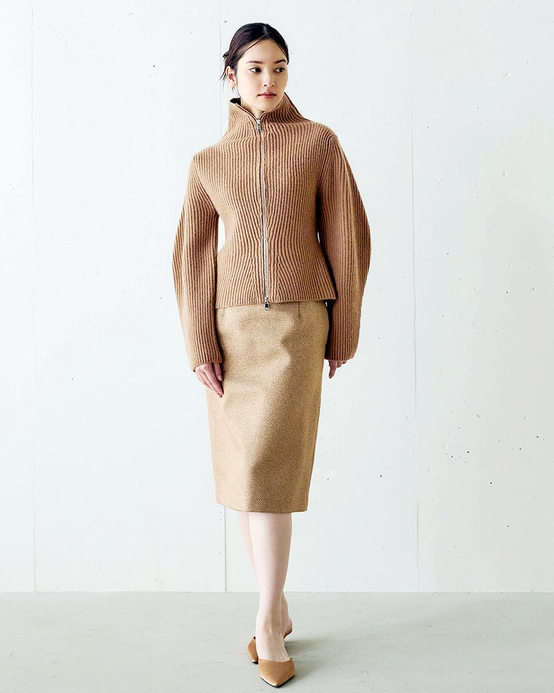 カーディガン風にもプルオーバー風にも着こなせるジップタイプのセーターは、着こなしの幅の広い秋冬の優秀アイテム。ミックスウールに圧縮加工を施したボイルドウールニットなら、カジュアルになりすぎずスマートに着こなせます。立体的な袖デザインや自然なウエストシェイプのシルエットで、ニットでもきれいめな大人のスタイルに。