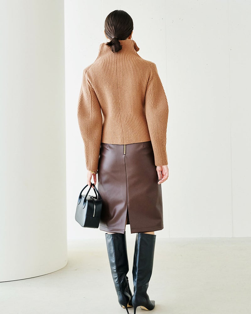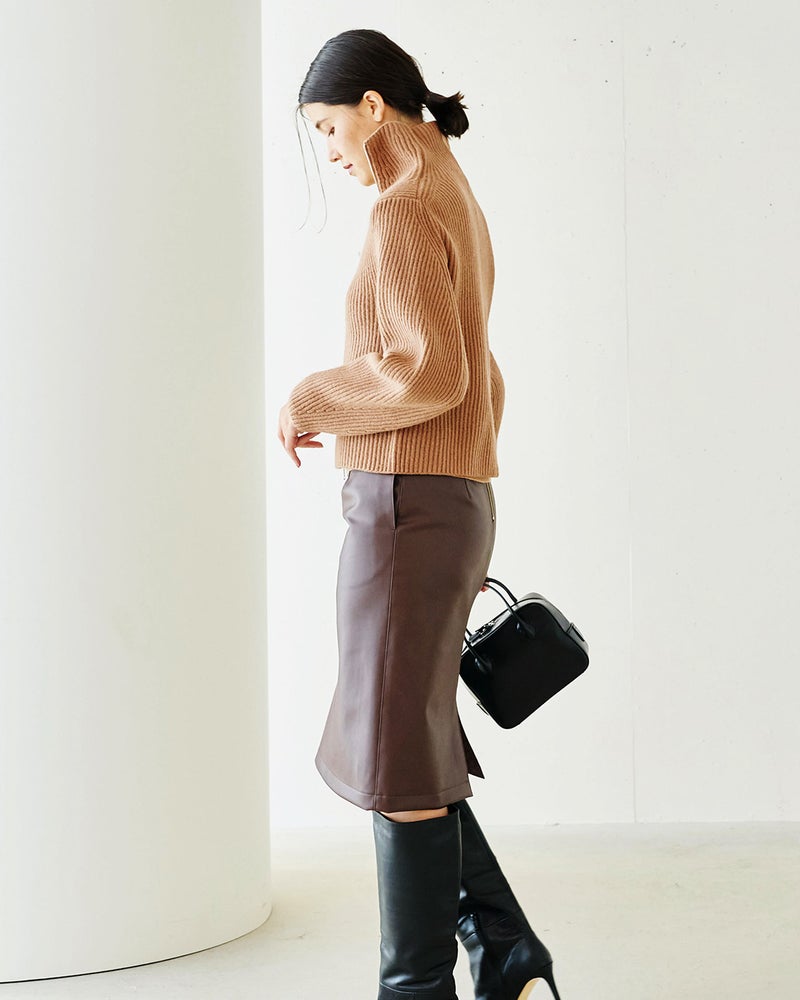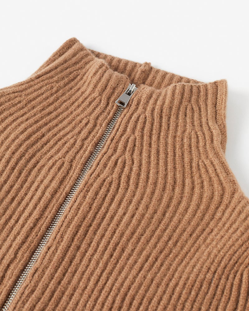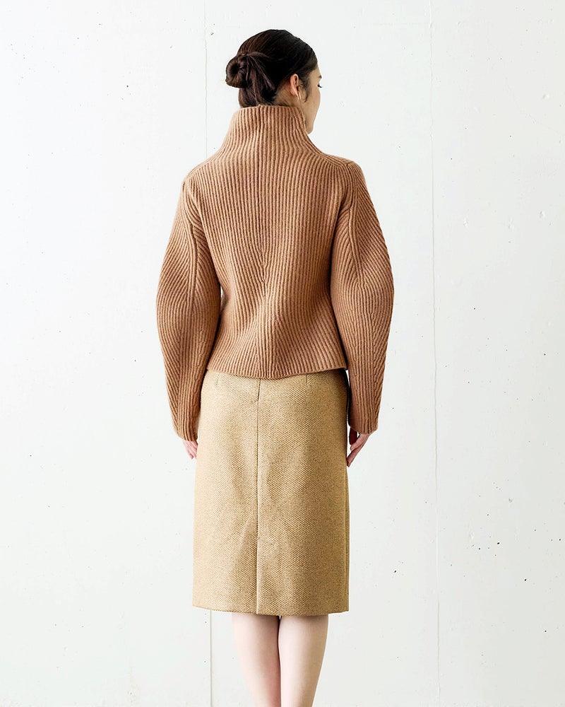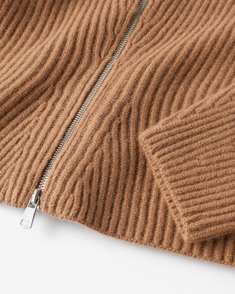 カーディガン風にもプルオーバー風にも着こなせるジップタイプのセーターは、着こなしの幅の広い秋冬の優秀アイテム。ミックスウールに圧縮加工を施したボイルドウールニットなら、カジュアルになりすぎずスマートに着こなせます。立体的な袖デザインや自然なウエストシェイプのシルエットで、ニットでもきれいめな大人のスタイルに。