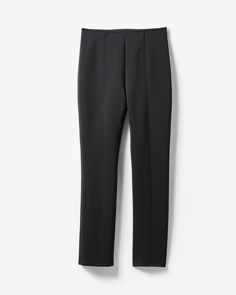 上質なダンボール素材で仕立てた細身のレギンスパンツは、ふわもこのビッグニットに合わせたり、ワンピースのインに仕込んだりとこの冬大活躍してくれそうなアイテム。ジェイドットならではの立体裁断テクにより、ヒップの位置を高めに設定した脚長シルエットが特長。品の良い艶とラク伸びするストレッチ性、そして下半身をすっきりと見せる構築性と三拍子そろったトリアセストレッチ素材を採用しました。