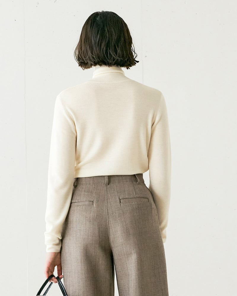 極細ウールを素材にした上質シアータートルは、秋冬の重ね着スタイルを格上げしてくれるアイテム。極細糸を丁寧に編み立ててから、防縮加工を施したスーパーファインメリノなら、かさつきがちな冬の肌にもうっとりとろけるような肌心地です。