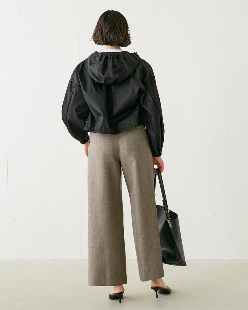 メゾンブランドからも指名される国産名品素材、尾州の梳毛ウール生地。たっぷりとしたツータックのワイドパンツに仕立てました。生地表面はニュアンスのあるシャークスキン。格調高いハリのある質感、ふっくらと厚みがありながら麻にも似たドライな手ざわりは、春先に着てこそ真価を発揮。下半身のラインを拾うことなく、お腹まわりからヒップにかけてすっきりと魅せるシルエットは、立体裁断ならでは。同素材のジャケット(14537)に合わせるのはもちろん、ブルゾンやTシャツといったカジュアル素材との相性も抜群。