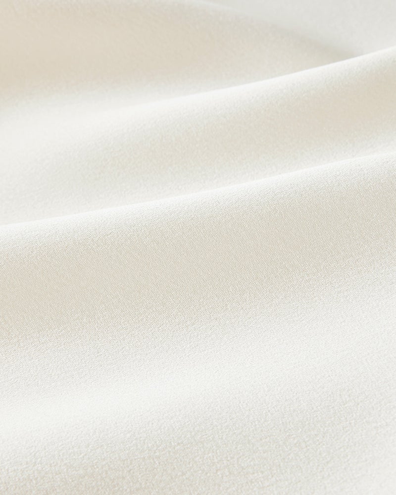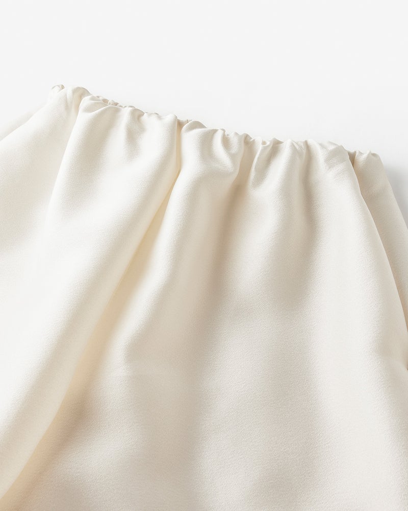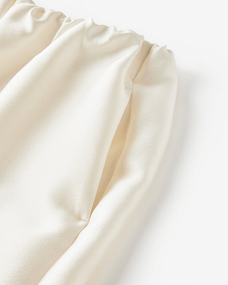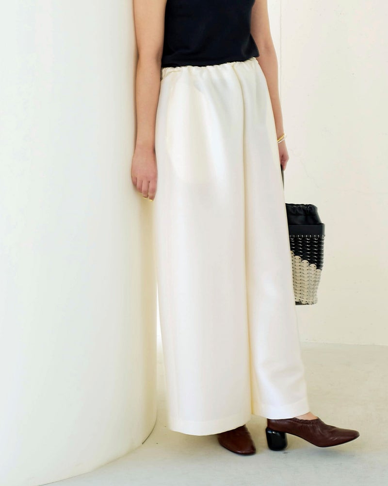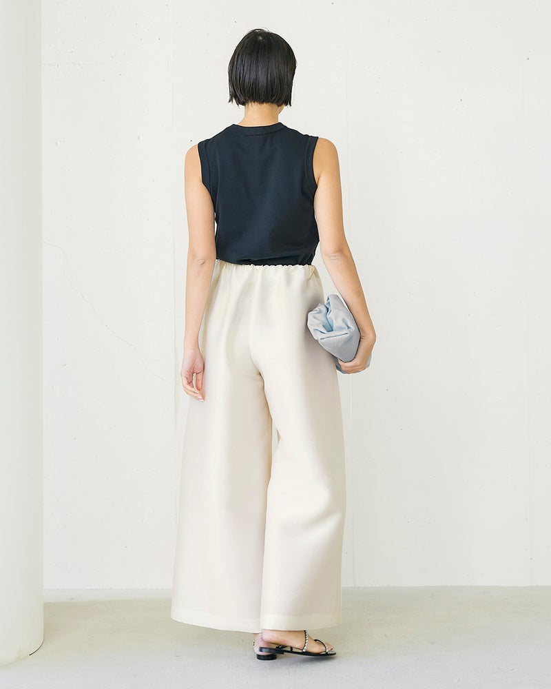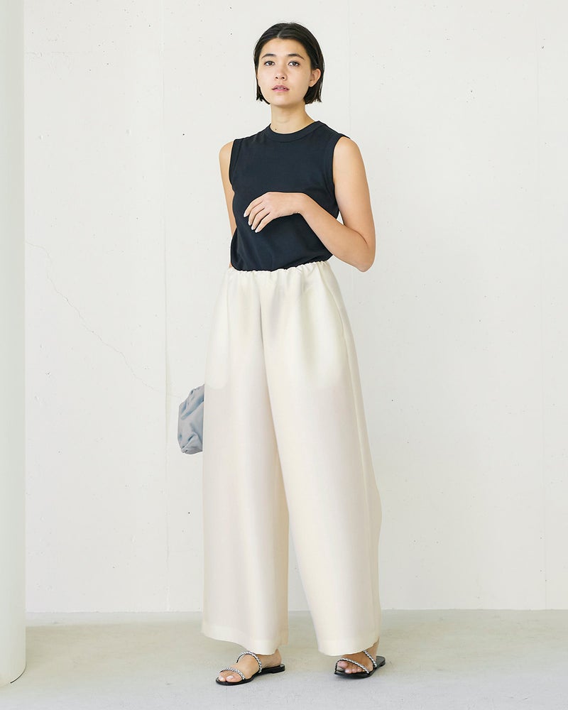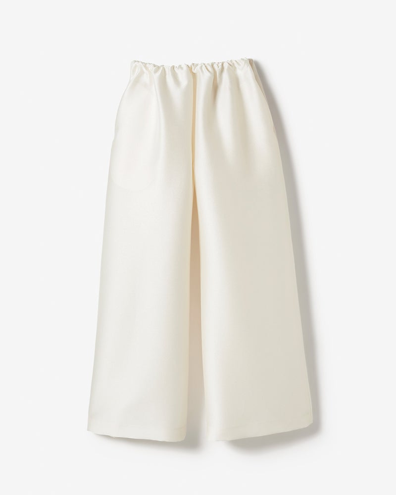 ブランドのシグネチャー素材であるオクタダブルクロスは羽のような軽さと絹の艶、フォルムを保つ構築性を実現。ウエスト部分はゴム仕様でリラックス感がありながらも、エレガントな光沢のある生地感と華やかなカッティングが目を引く主役級パンツ。構築性のある生地感を活かした太めの筒幅で、下半身をカバーしながらドラマティックな着こなしに。