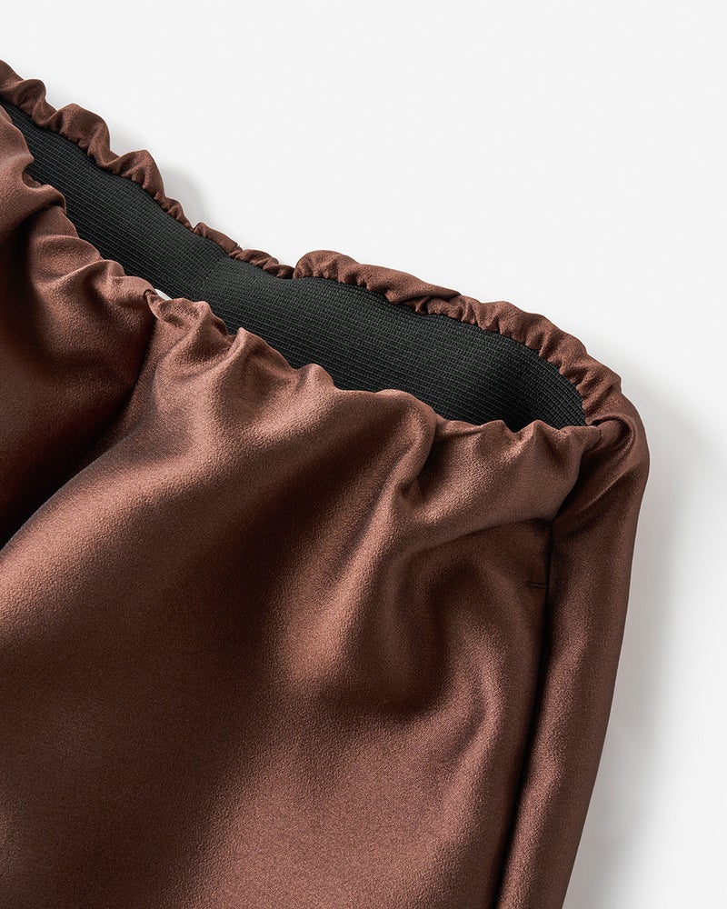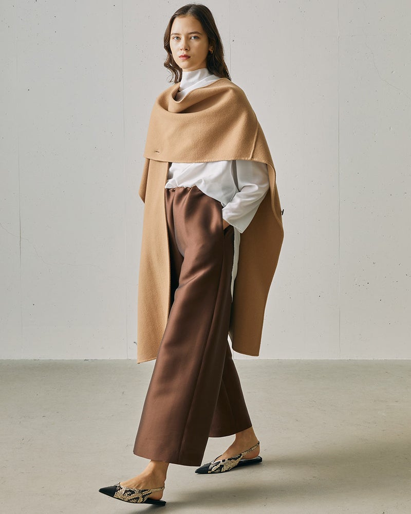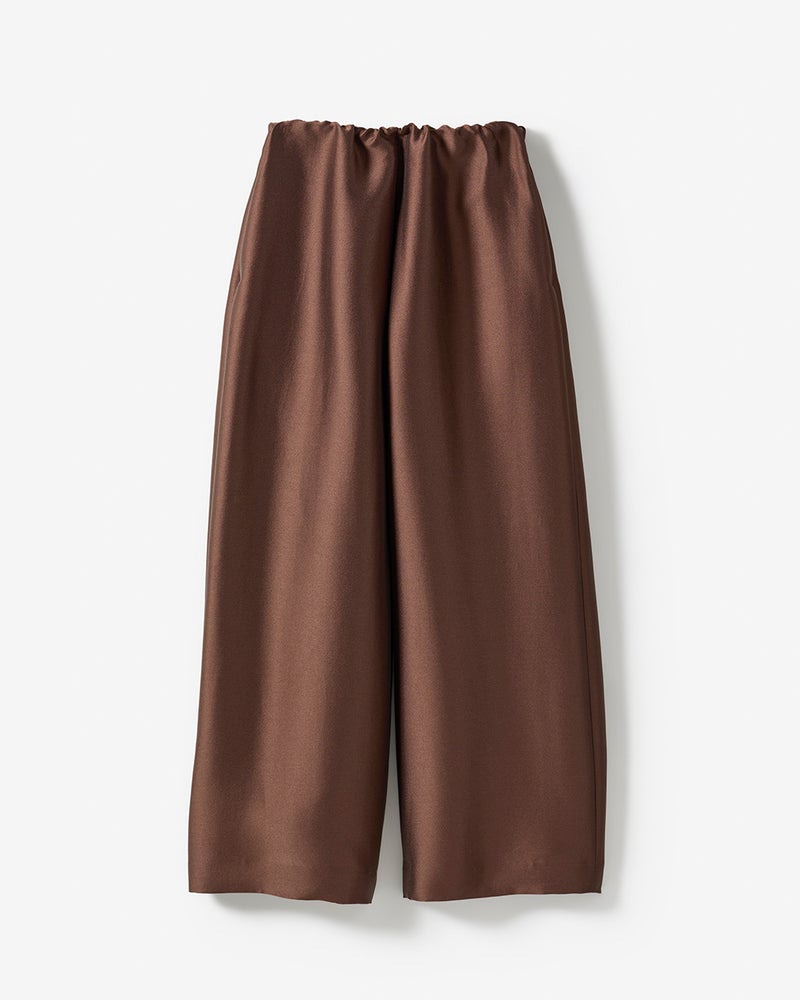 ブランドのシグネチャー素材であるオクタダブルクロスは羽のような軽さと絹の艶、フォルムを保つ構築性を実現。ウエスト部分はゴム仕様でリラックス感がありながらも、エレガントな光沢のある生地感と華やかなカッティングが目を引く主役級パンツ。構築性のある生地感を活かした太めの筒幅で、下半身をカバーしながらドラマティックな着こなしに。