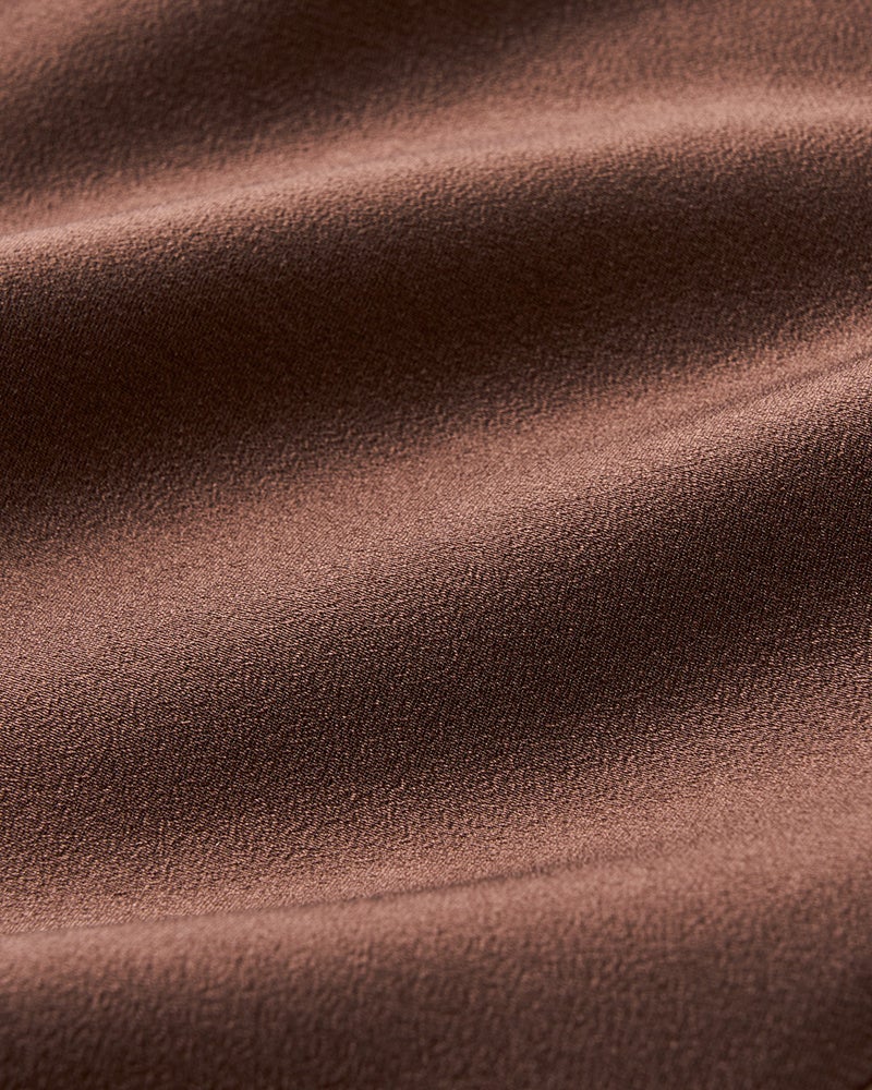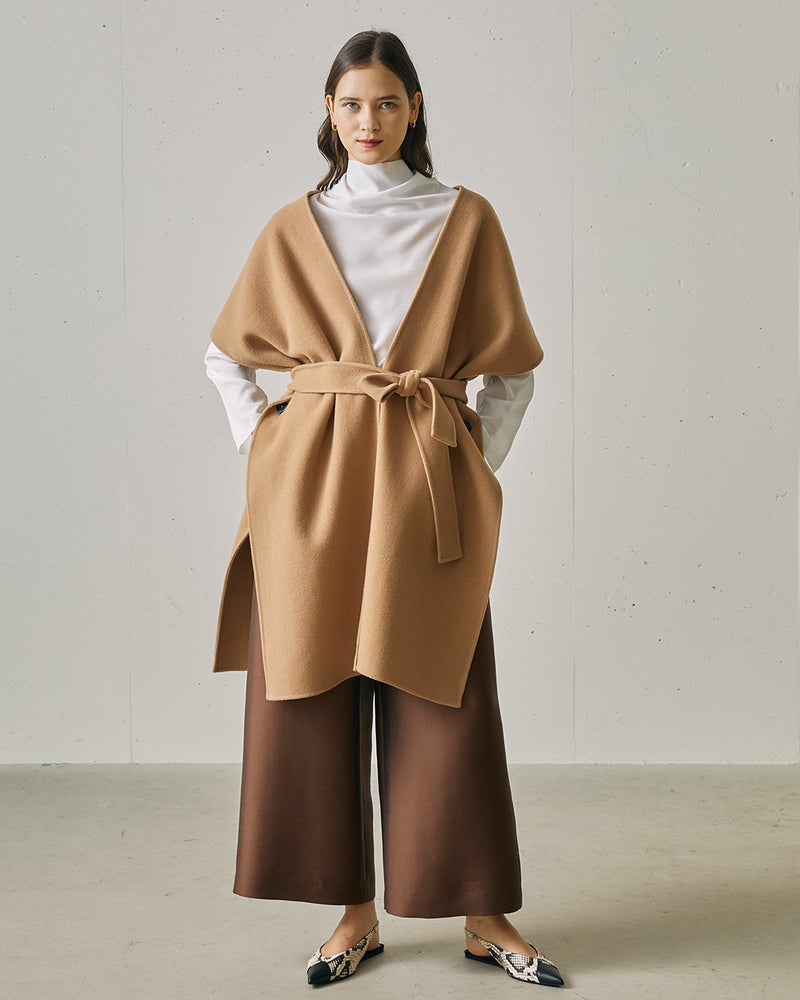 素材に選んだのは、海外のトップメゾンからも使命指名の絶えない名品素材、「オクタダブルクロス」。和服の正絹をイメージして生み出された生地は、糸の中心が空洞になったパスタ構造の糸を用いており、羽のような軽さと絹の艶、そしてフォルムを保つ構築性は「未来のシルク」とでも呼びたい美しさ。