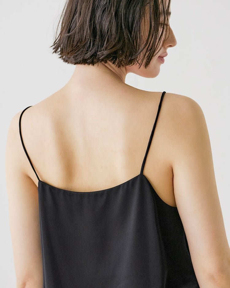 ラグジュアリーな光沢をほしいままに味わえる、ダブルサテン素材のドレスキャミソール。裾には精緻な刺繍レースをあしらい、華奢なストラップとあいまって、繊細な女らしさを演出。ジャケットのインナーとして、あるいはブラウスやニット、カットソーとの重ね着にも活躍します。