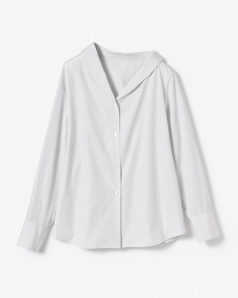 きりりと見せつつ遊びごころあふれるストライプシャツ。左右をアシンメトリーにカッティングしたオフショルダー気味の衿は、うなじから鎖骨にかけての女性らしさをひきたてる効果が。素材には世界有数の超長綿、スーピマコットンを使用。高密度に織り上げることにより、スーピマならではのシルキーな光沢、しなやかな風合いを堪能できる一枚。