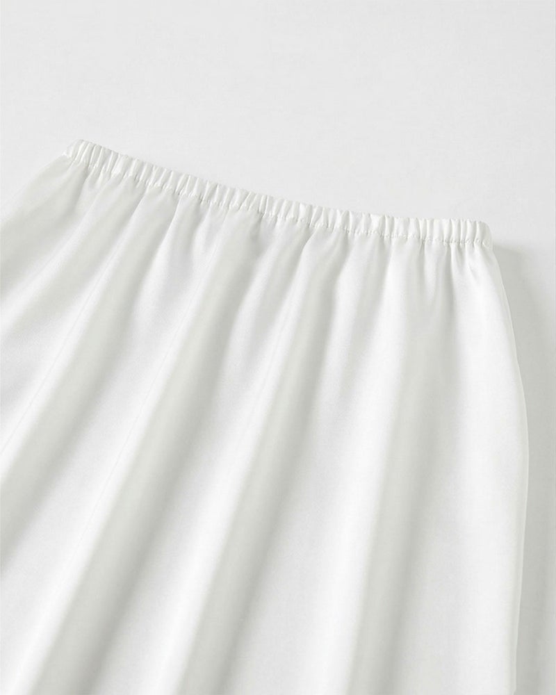 ラグジュアリーな光沢をほしいままに味わえる、ダブルサテン素材のスカート。裾に精緻な刺繍レースをあしらい、一枚でも絵になる存在感。またはチュールスカートなどのインナーにはいても、とびきり贅沢な印象に。晴れの場の主役になれる華やかさを備えつつ、ウエストゴムでリラックスした着心地です。裾さばきが楽なサイドスリット入り。