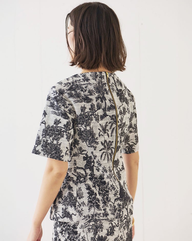 首筋を美しく魅せる計算されたクルーネックライン、精緻なダーツ処理で叶えたウエストシェイプのシルエット、二の腕も気にならないスマートなハーフスリーブ。大人の女性がさっと着て美しく映える、立体裁断仕立てのフォルムブラウス。素材として採用したのは美しいボタニカル模様を緻密なジャカード織りの技術で叶えた、イタリア・SILKCOMO社製の上質なジャカード生地。同素材のボトムスと合わせた贅沢な着こなしはもちろん、日常スタイルのアクセントアイテムとしてもおすすめ。