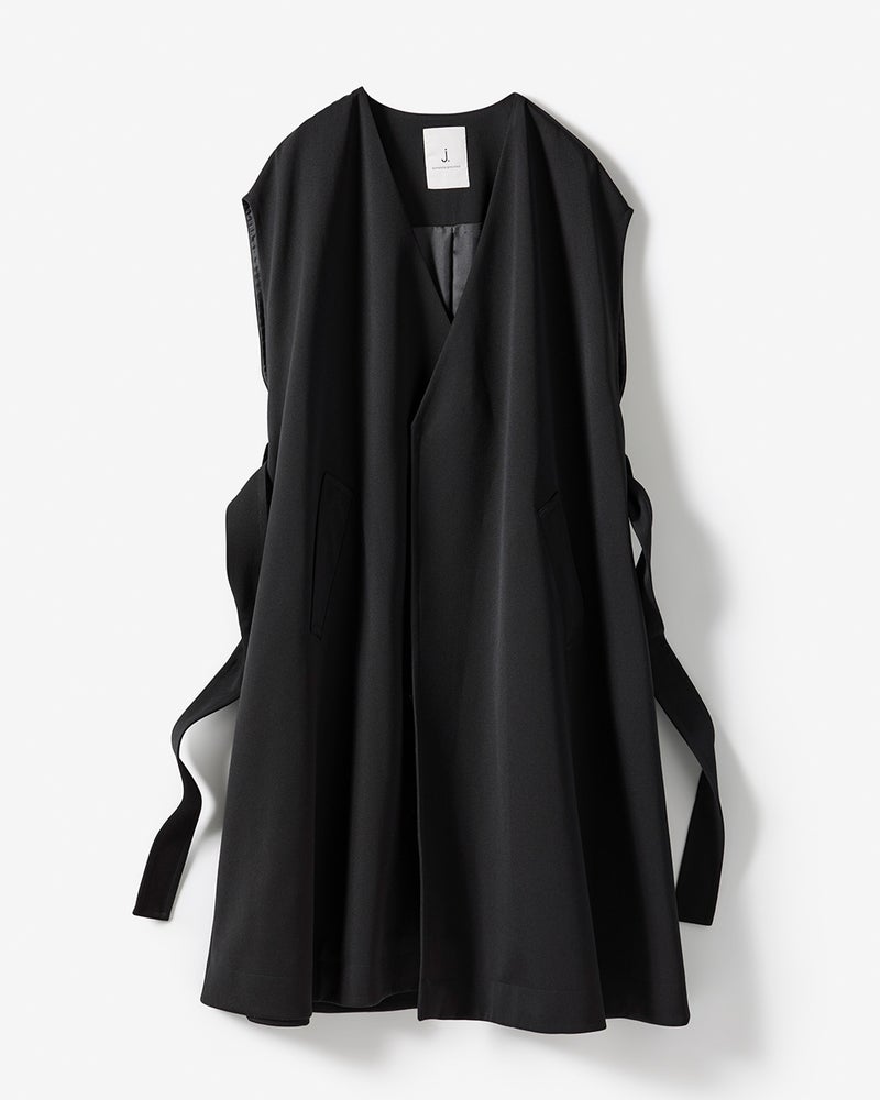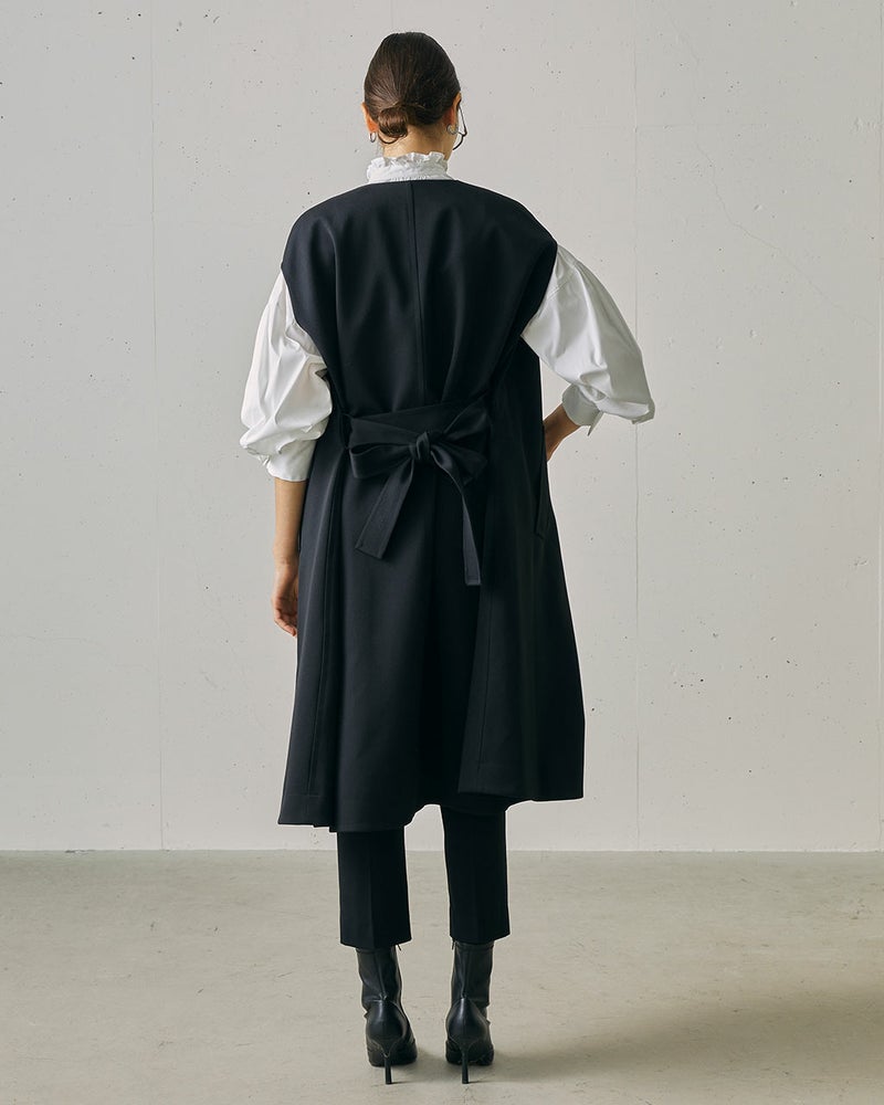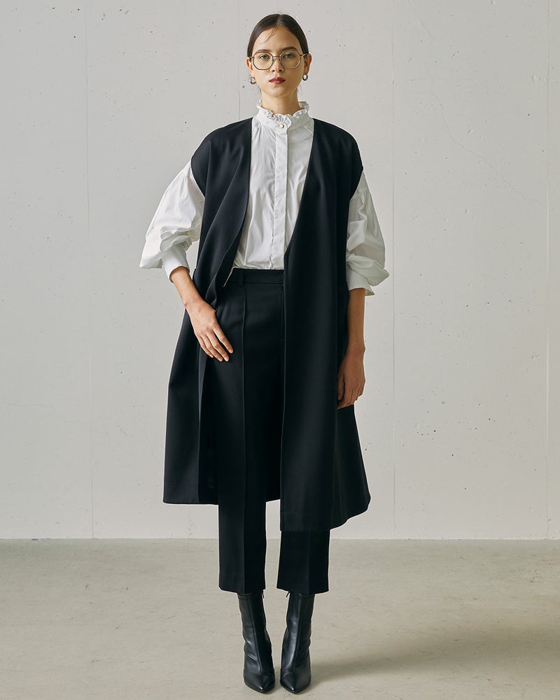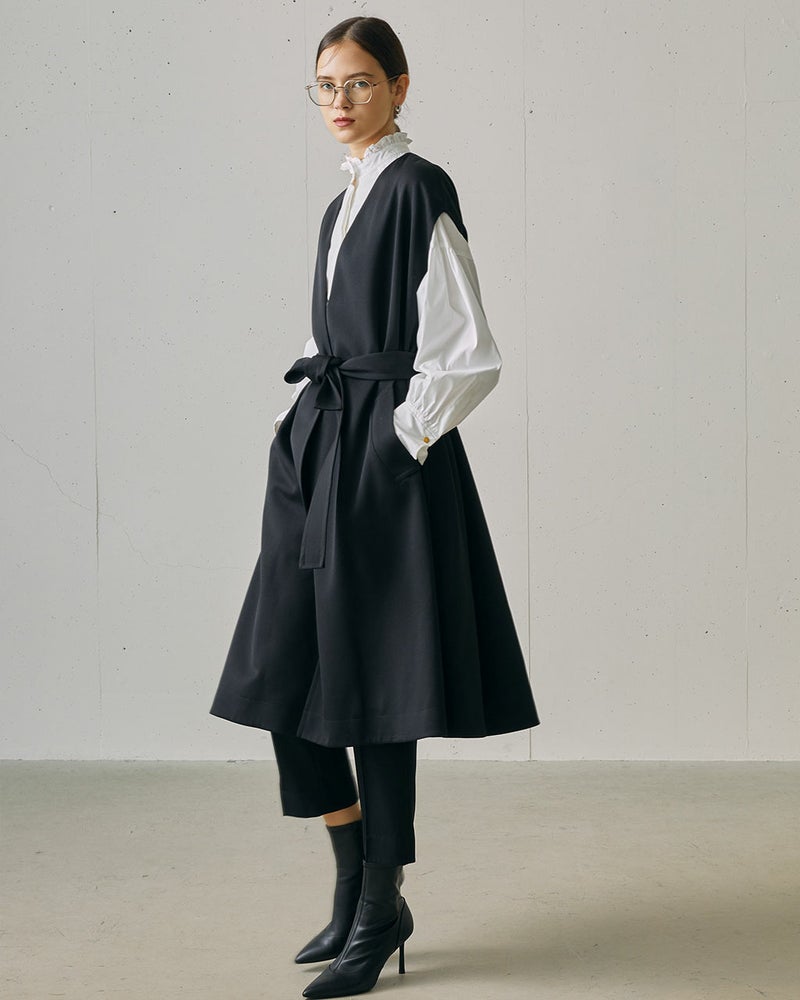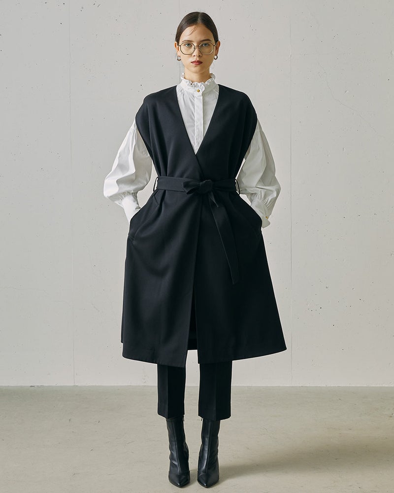 さっと羽織るだけで旬の表情がつくれるジレ。端境期にトレンチコートを着る感覚で着られるよう、生地をたっぷりと使い、きれいなドレープが生まれる設計に。アームホールは広めにとり、バックスタイルにはタックをあしらったチャーミングなシルエット。 ヴァージンウールとヴィスコースをミックスし、三子撚糸と呼ばれる3本の糸を撚り上げる技法により、艶感とハリのある表情の素材に仕上げました。同生地のウエストベルト付きで、幅広い着こなしが可能。