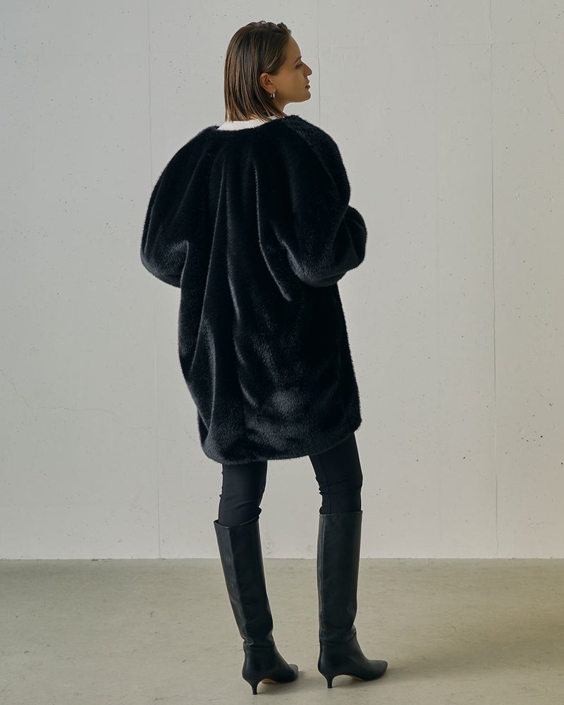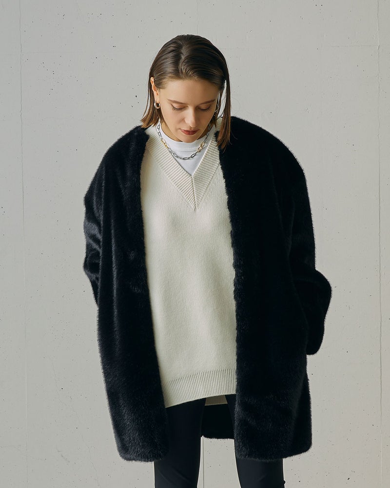 特別な装いだけでなく、今やファーコートはカジュアルにも着られる大人のための冬アウター。メゾンブランド御用達のファクトリーから選んだのは、リアル顔負けの艶となめらかさを持つラグジュアリーなエコファー素材。ゆったりとしたオーバーサイズシルエットのノーカラーデザインは、ドレスにもデニムにも合わせたい1着。