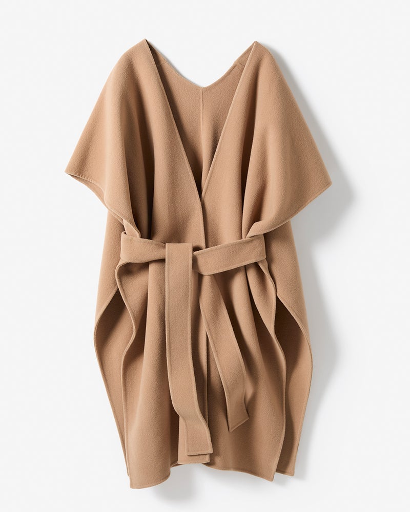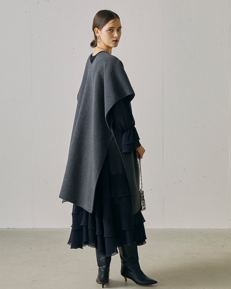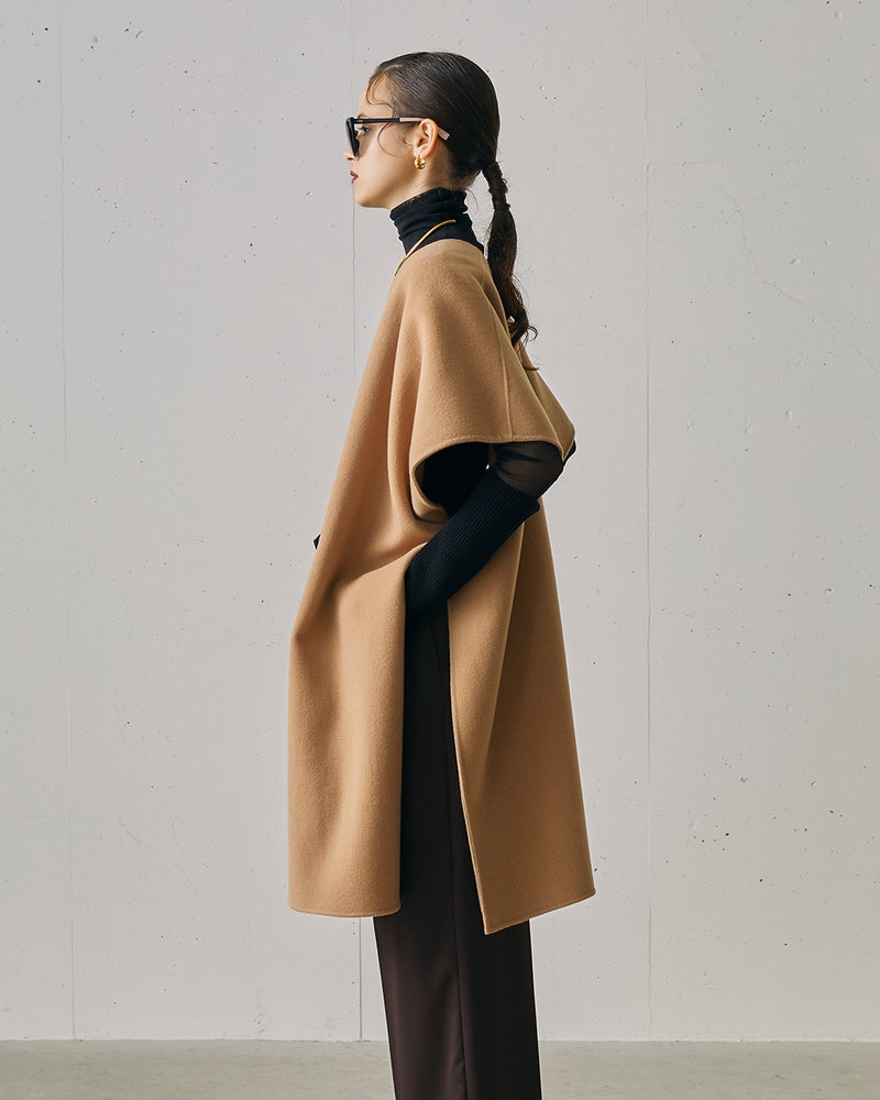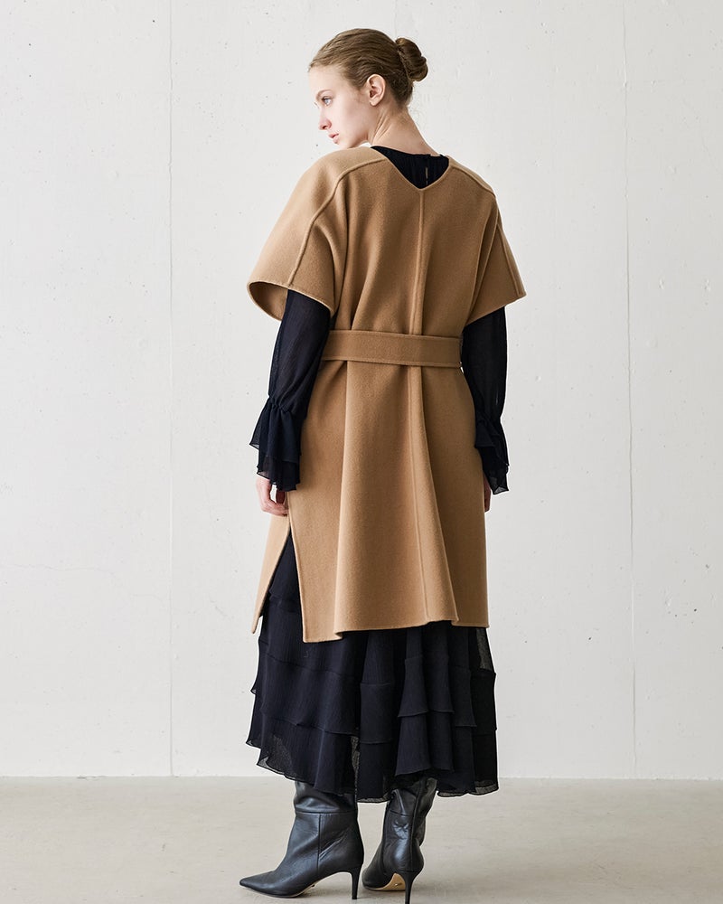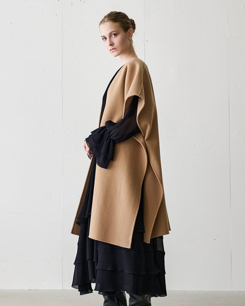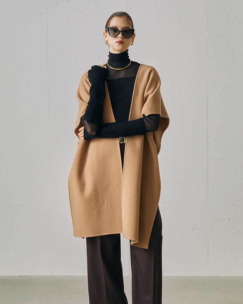 ラグジュアリーとコンフォートを完全両立した、ウールリバー素材のストール風ジレコート。脇縫いをしていない一重仕立てのデザインは、ジレ風に羽織ったり、ウエストマークをしたり、冬はコートの上からマフラーのように巻くこともできるマルチWAYが魅力。秋口から真冬までロングシーズン活躍してくれるアイテム。