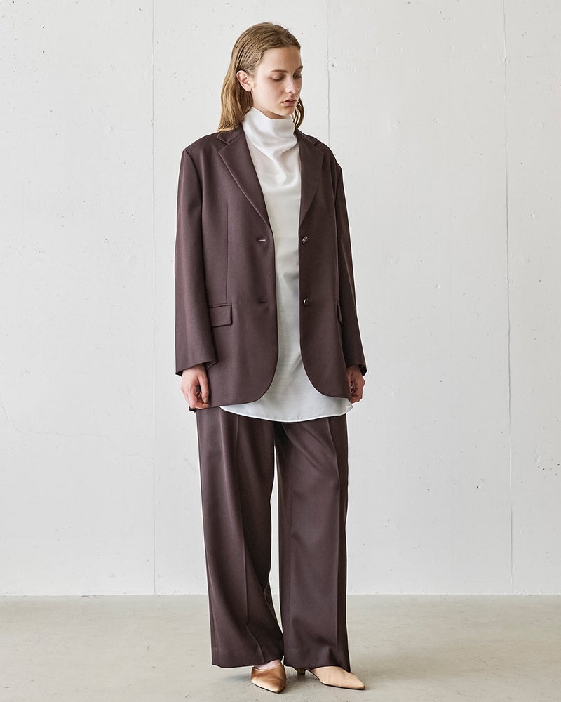 端正なイメージを保ちつつ、今年らしいこなれ感やモードな遊び心をプラスできるオーバーサイズのテーラードジャケット。大人が取り入れやすいよう、上質素材をチョイスしました。オーストラリア産のヴァージンウールSUPER100とヴィスコースをブレンドし、梳毛糸に仕立てた生地は、メンズライクでクラシカルな風合いが魅力。ボクシーでありながら、どこか女性らしいシルエットは、デニムなどのカジュアルなボトムスはもちろん、甘めのワンピースドレスにもフィット。同素材のワイドパンツ(14679)とのセットアップもおすすめ。