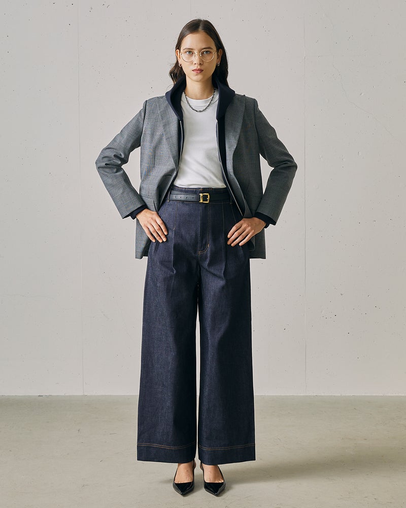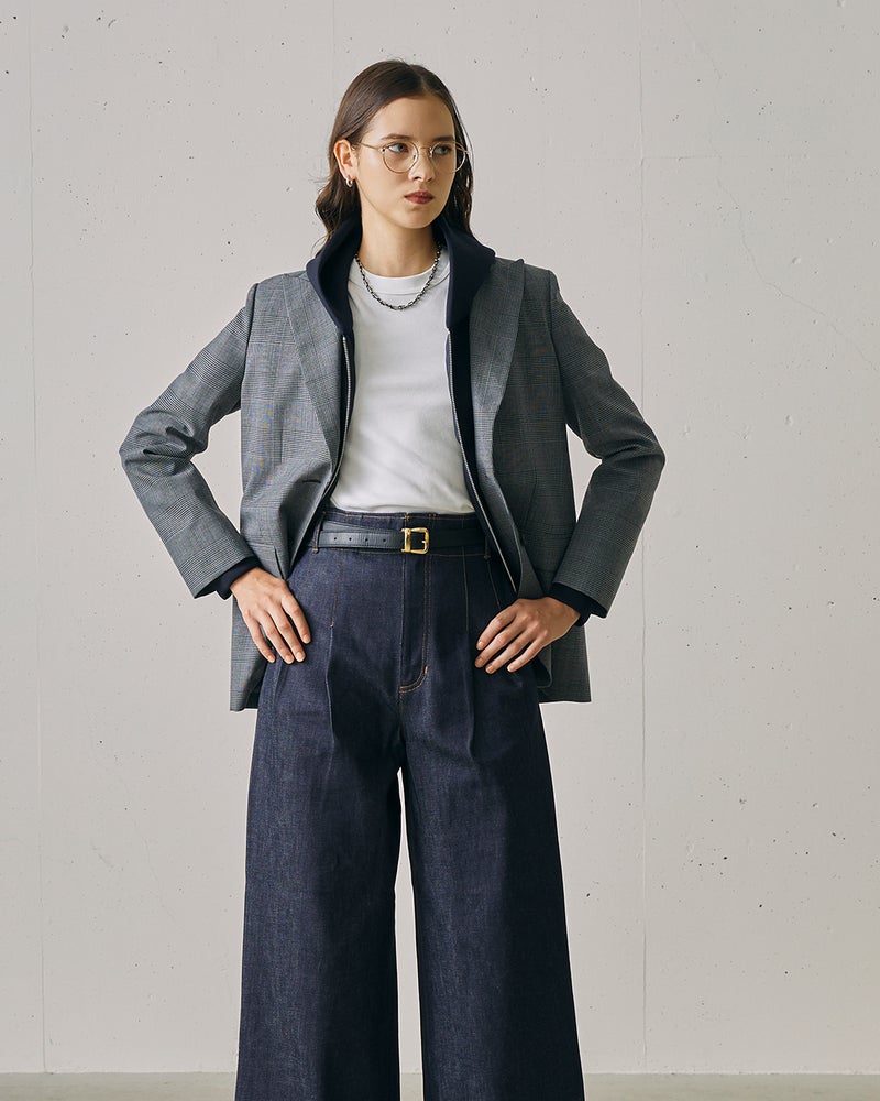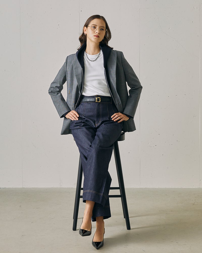 程よくボクシーな、ストレートラインのジャケット。ピークドラペルのテーラードカラー、シングルブレストの正統派な1着。素材に選んだのは、有名メゾンの支持を集めるイタリアの名門生地ファクトリーから届いた、選りすぐりのウール混ポリエステル。ジェントルシックなグレンチェック柄だから、どんなアイテムを合わせてもハンサムな表情に。あえてデニムなどのカジュアルなスタイルに羽織るのもいいし、同素材のパンツ(14677)やスカート(14697)とのセットアップなら、よりスタイリッシュ。