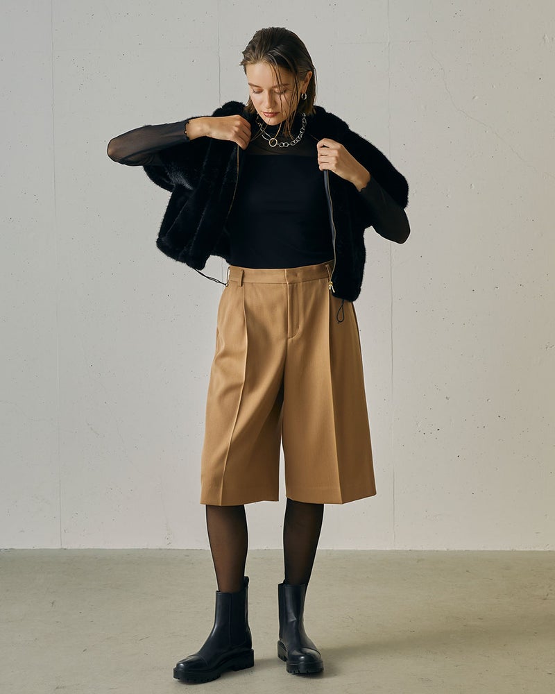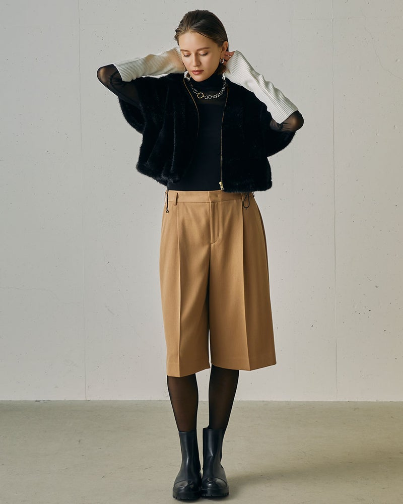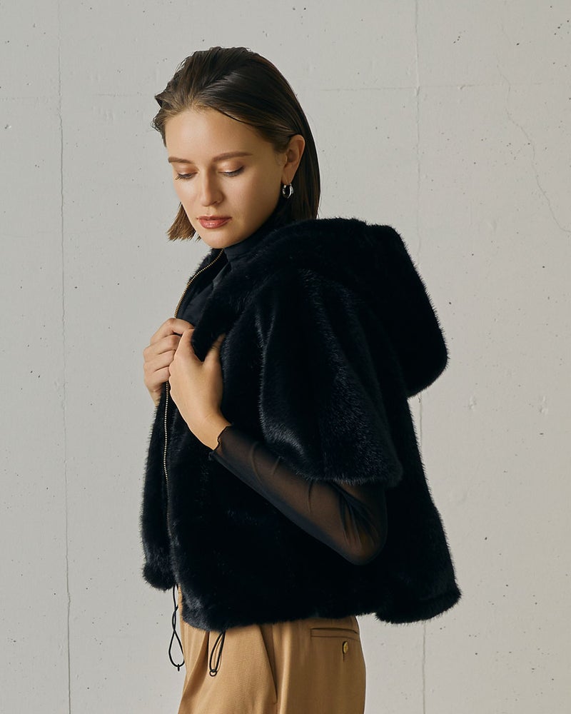 洗練の度を高めたカジュアルスタイルを楽しみたいなら、ファーブルゾンがおすすめ。光沢のあるミンク調のエコファーは、贅沢なボリューム感があるのに驚くほど軽い着心地。ハーフスリーブ&短めの丈で、コンパクトな仕上がりも「今」の空気感。合わせるアイテムによって、クラシカルにもフェミニンにも、振り幅のある着こなしが完成する1着。