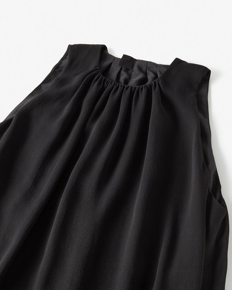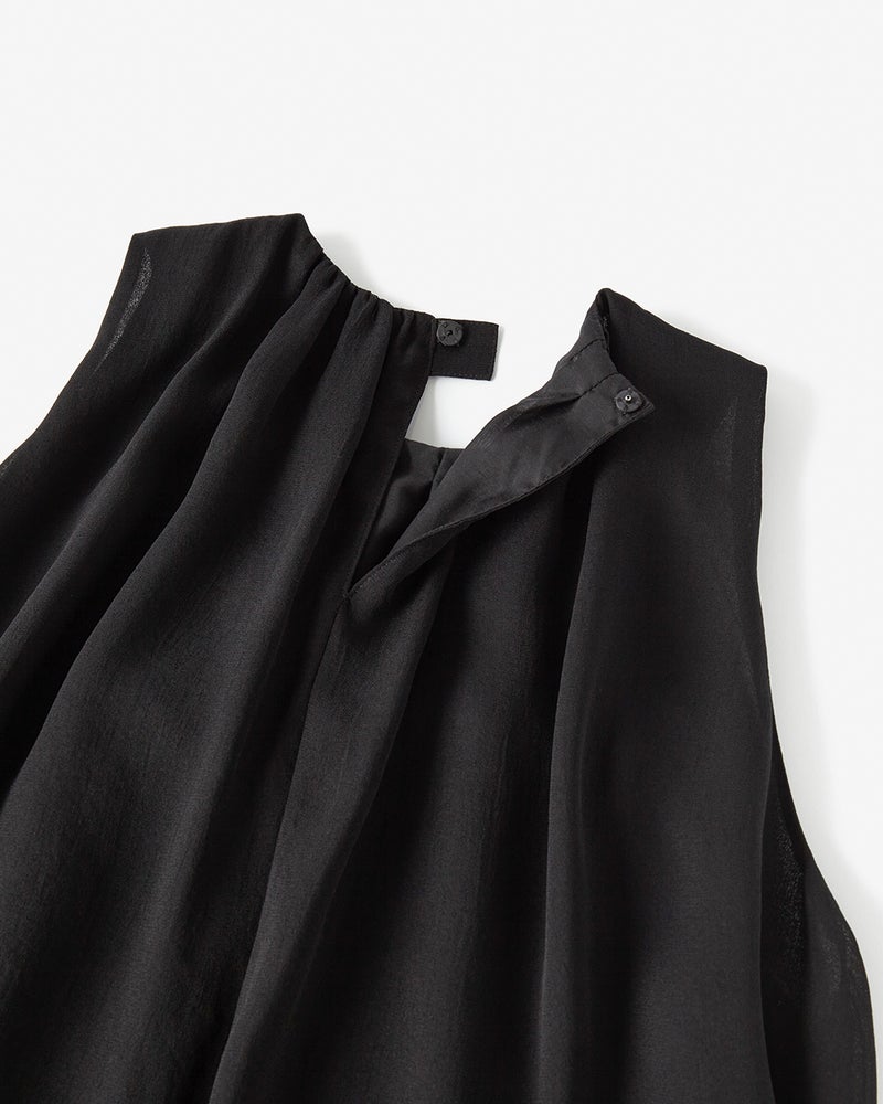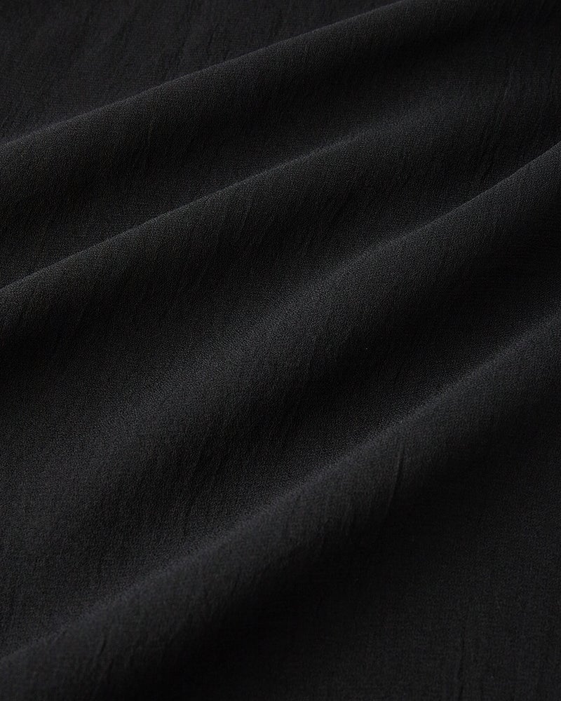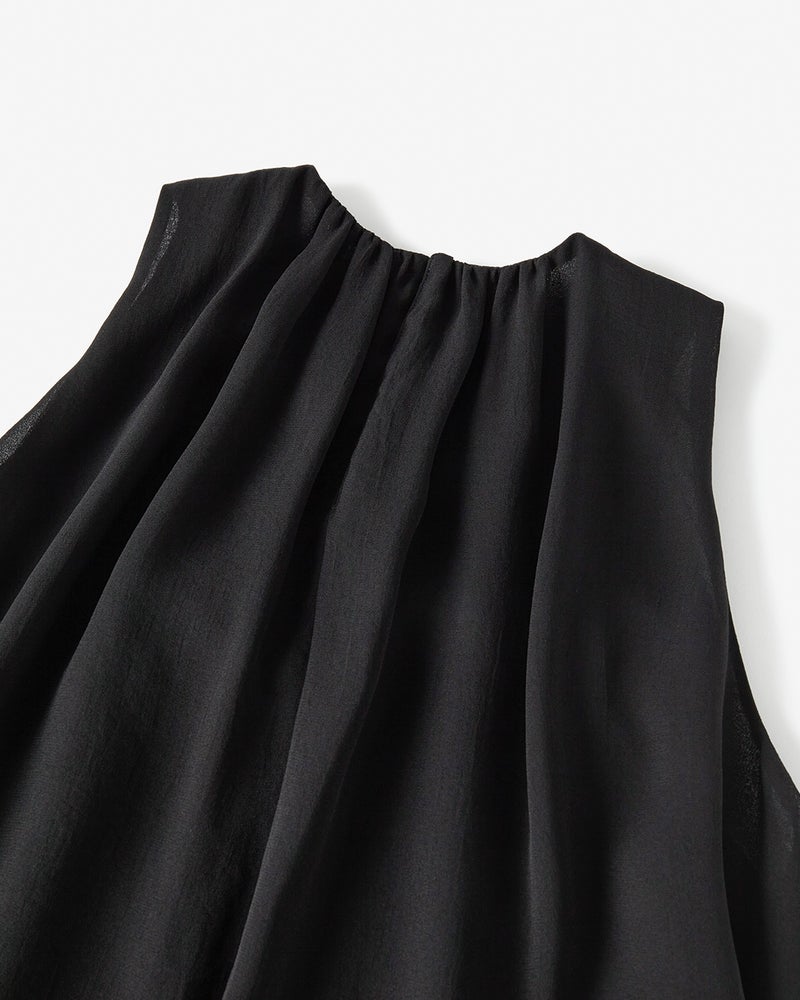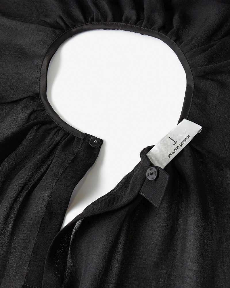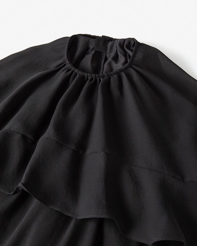 デイリーからオケージョンシーンまでさまざまに活躍するフリルブラウス。素材に選んだのは、とろみと落ち感のあるトリアセジョーゼット。一枚で着ても透けにくく、ドライタッチでさらりとした着心地。ノースリーブのブラウスに、肩から腕をカバーするように重なるオーバースリーブのラッフルフリルが華やかな印象。フリルケープは取り外し可能で、着こなしの幅が広がる1着。