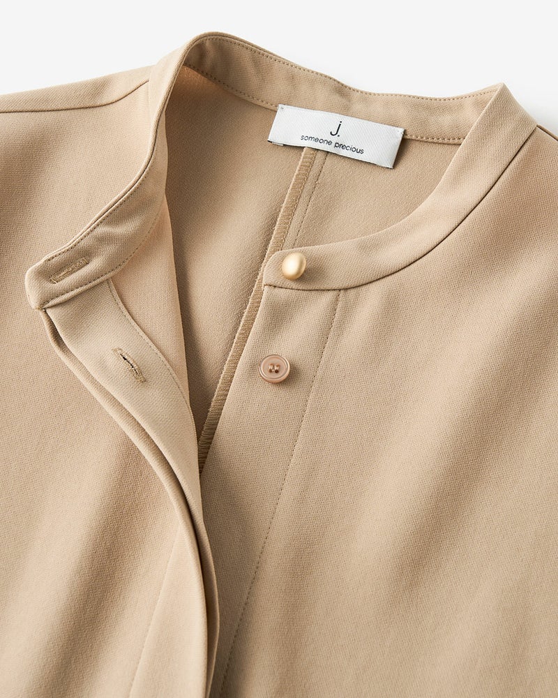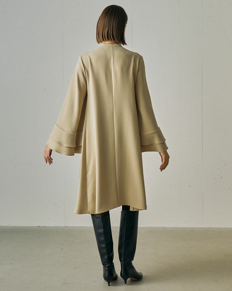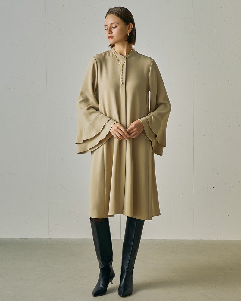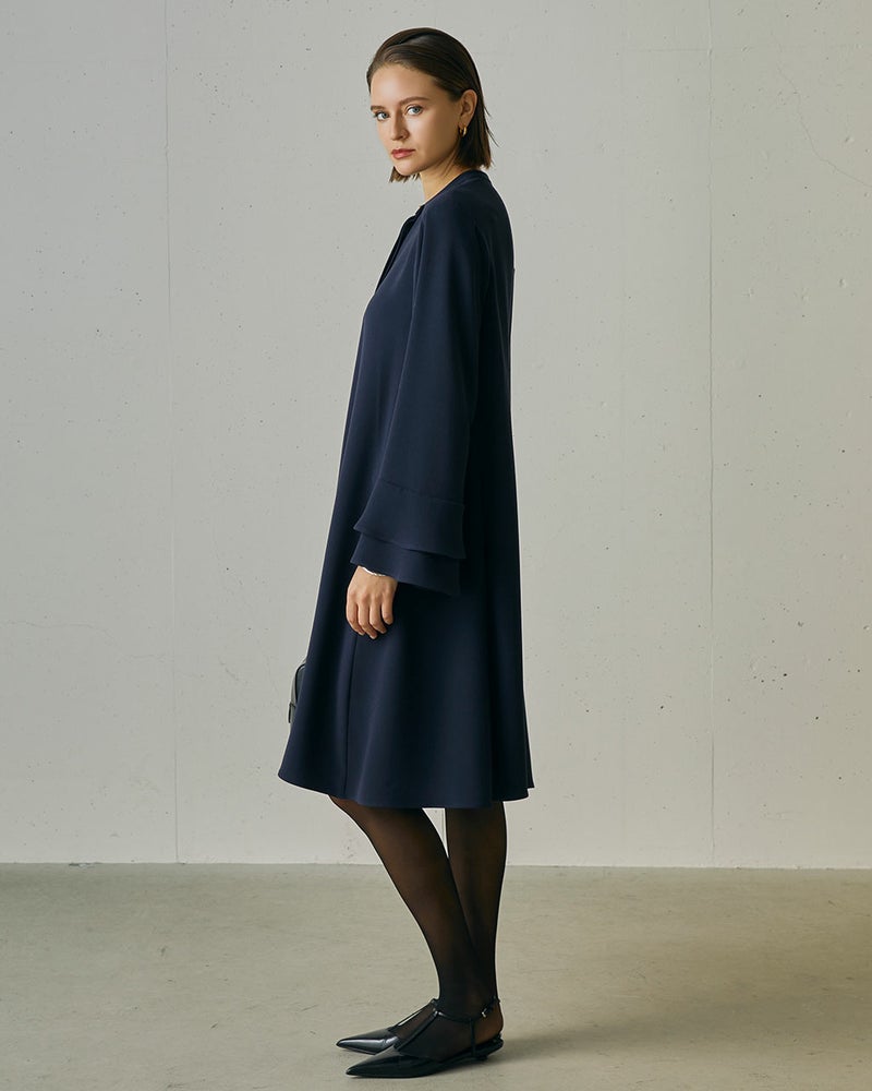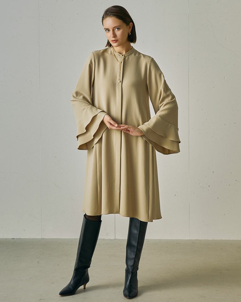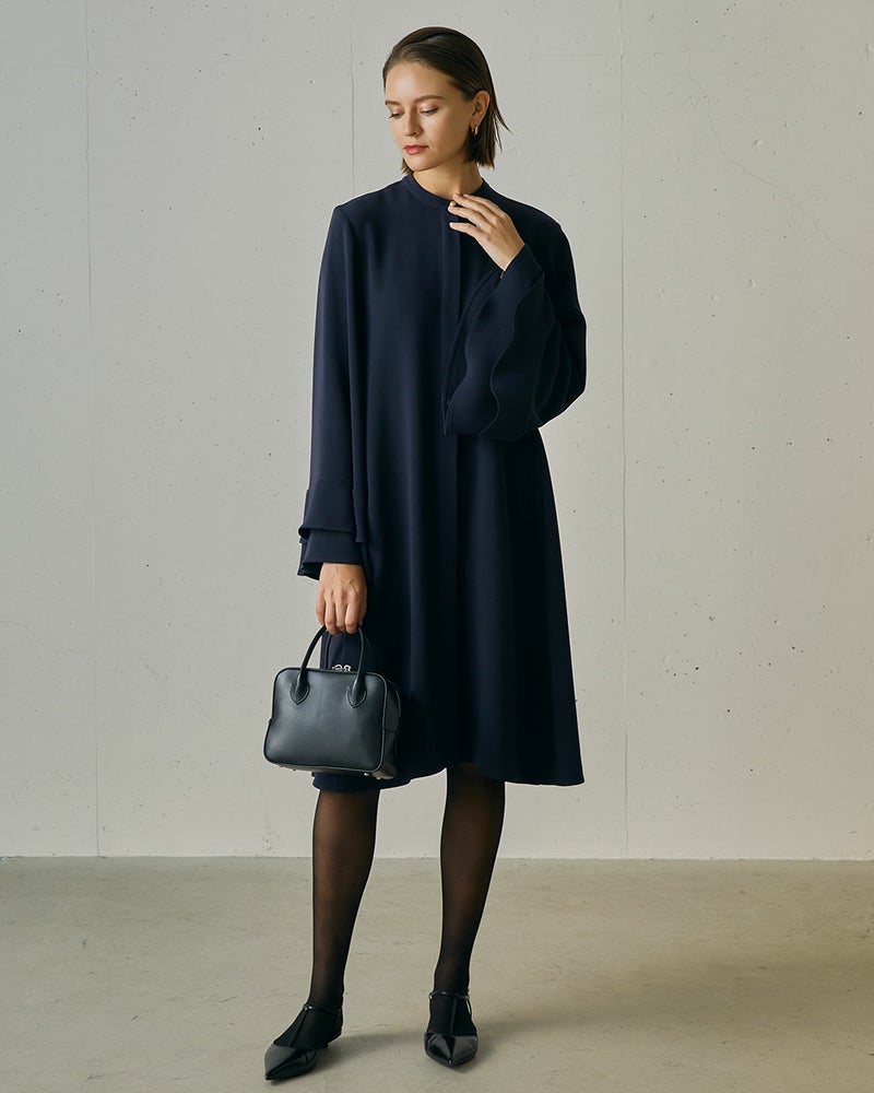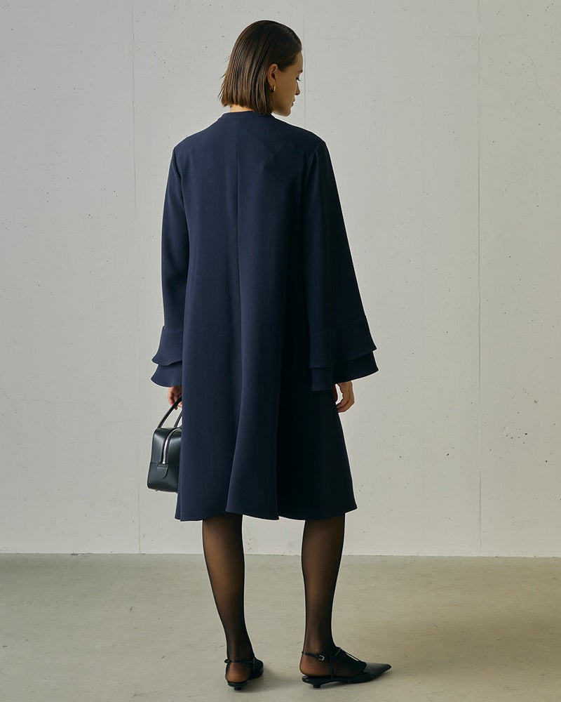 日常はもちろん、パーティーシーンなどはなやいだ場でも存在感を放つワンピース。袖先のゆったりとひらめく2段フリルが、優美な印象をアップ。光沢ときれいな落ち感のあるダブルクロスは、身体の線を拾わず、しかもなめらかな曲線をひき立ててくれる。さらりとした肌ざわりで、ほどよくストレッチが効いているので、快適な着心地。
