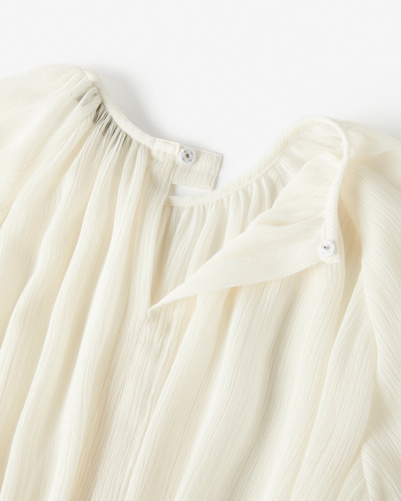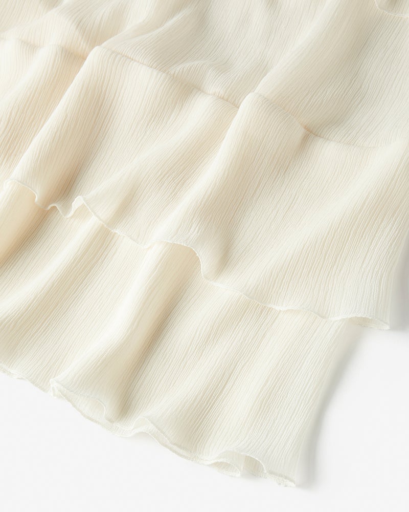 幾重にも重ねたフリルが美しい陰影を描く、ボヘミアン&ロマンティックなシフォンワンピース。ギャザーネックのAラインシルエットをベースに、袖口とスカートには2段のフリルを重ねて甘い雰囲気に。素材はほどよい透け感と美しいシボが魅力のシルク風クレープ。秋冬はニットやコートを羽織って、春夏は1枚でさらりと、ロングシーズン楽しめるのも魅力です。