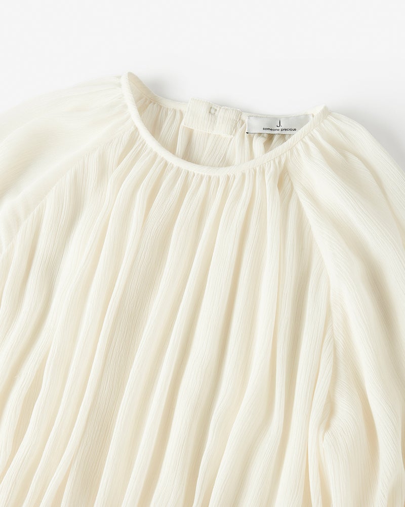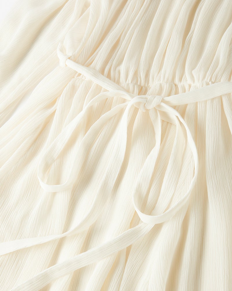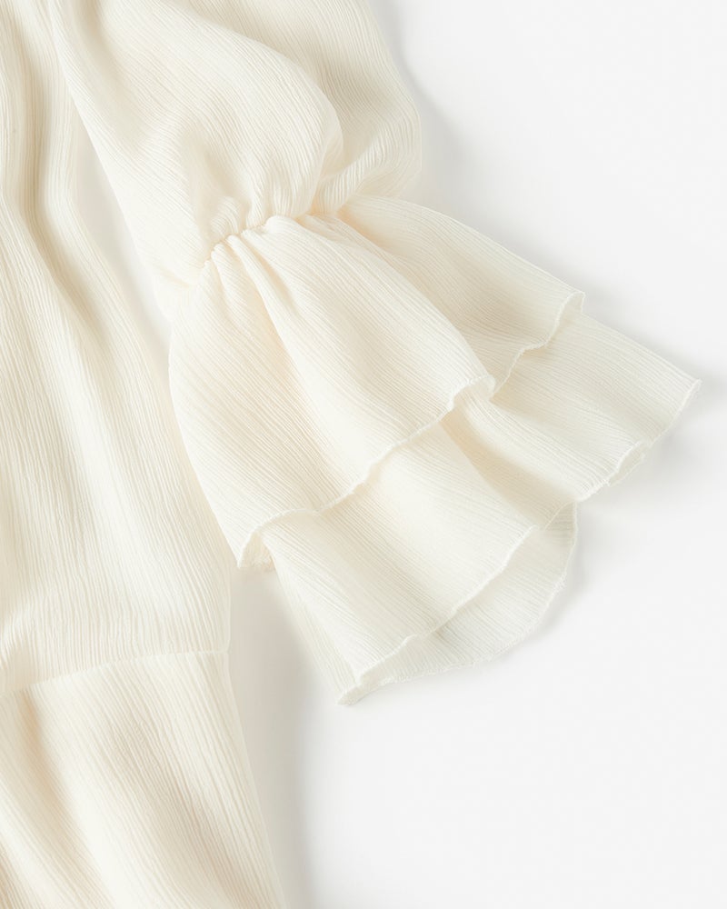 幾重にも重ねたフリルが美しい陰影を描く、ボヘミアン&ロマンティックなシフォンワンピース。ギャザーネックのAラインシルエットをベースに、袖口とスカートには2段のフリルを重ねて甘い雰囲気に。素材はほどよい透け感と美しいシボが魅力のシルク風クレープ。秋冬はニットやコートを羽織って、春夏は1枚でさらりと、ロングシーズン楽しめるのも魅力です。