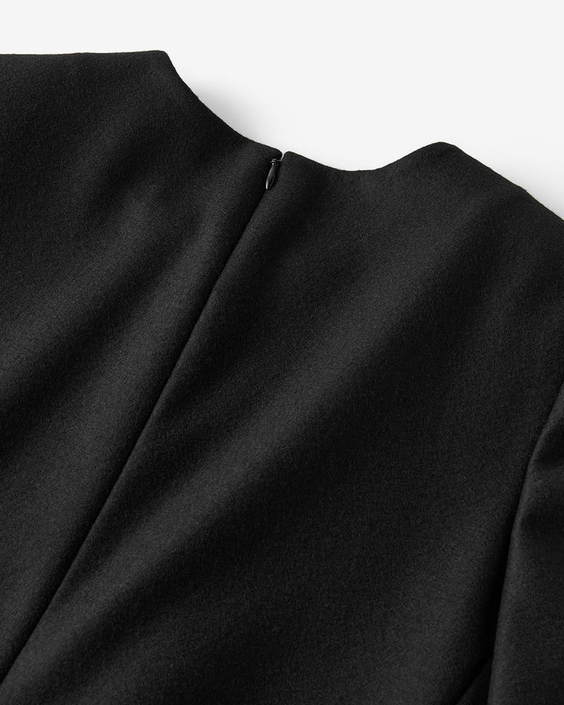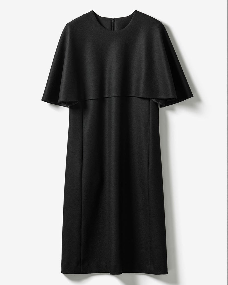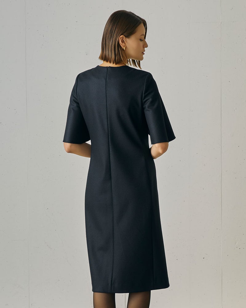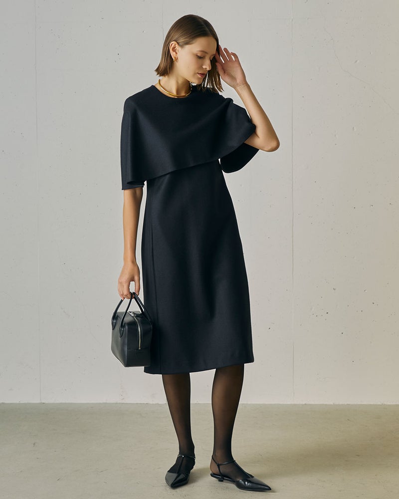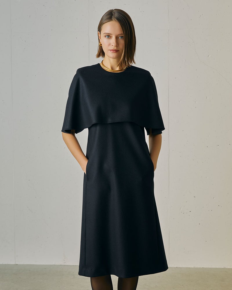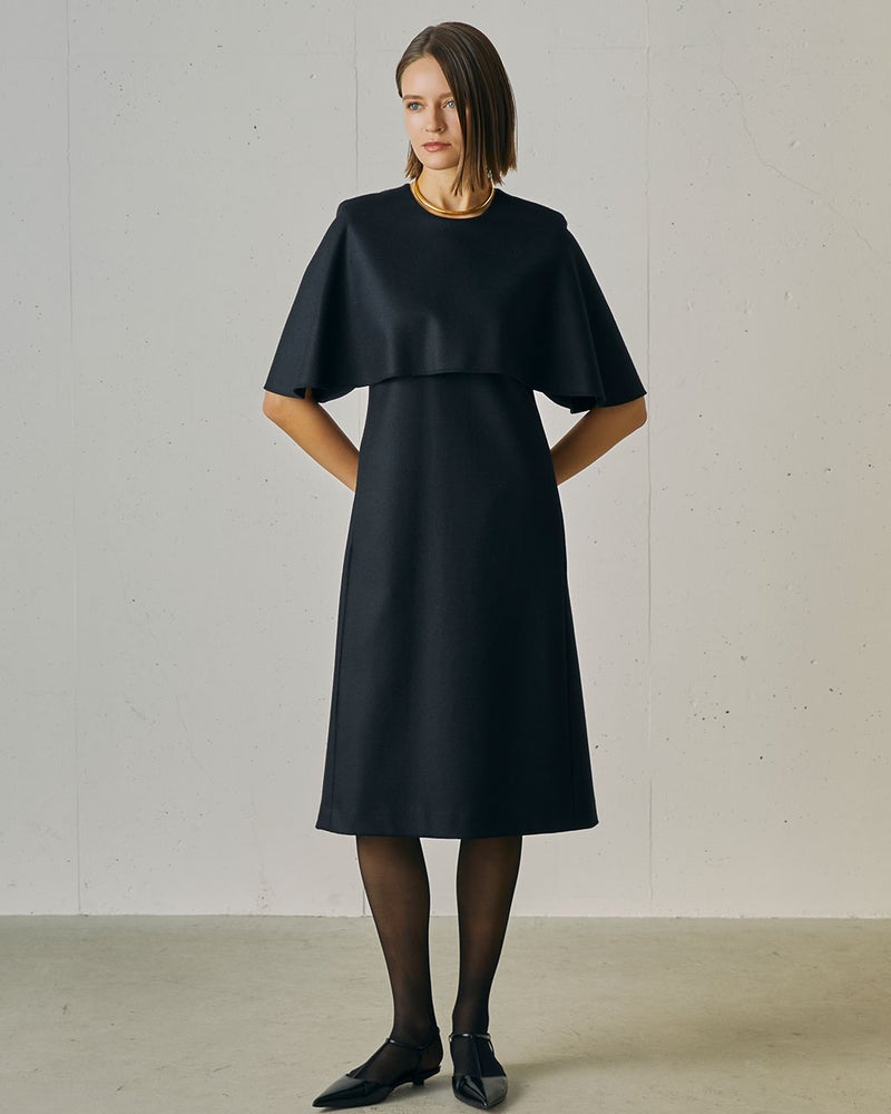 ケープを思わせるカラーが、フェミニンな印象を醸し出すワンピース。光沢のある生地は、繊細にして上質なウール糸「-/60 SUPER140S」を従来よりも緩やかに編みたて、メルトンのような縮絨効果を実現したもの。なめらかでしなやかな質感に加え、フィットアンドフレアの流れるようなシルエットも魅力。オケージョンシーンでも活躍必至の一枚。