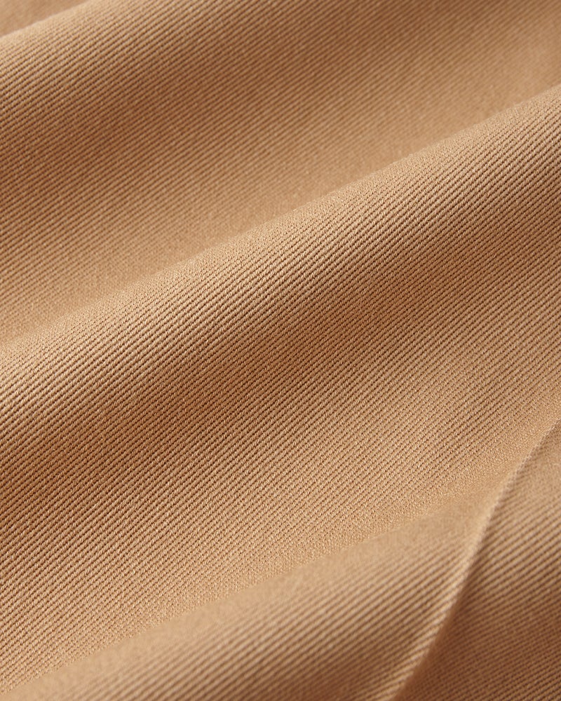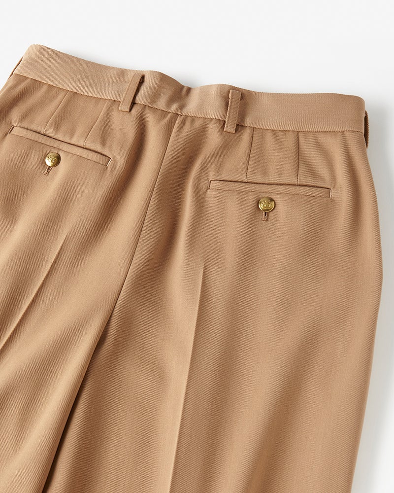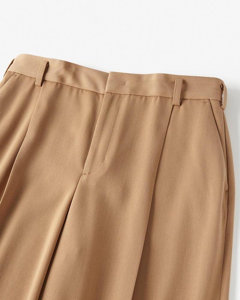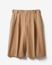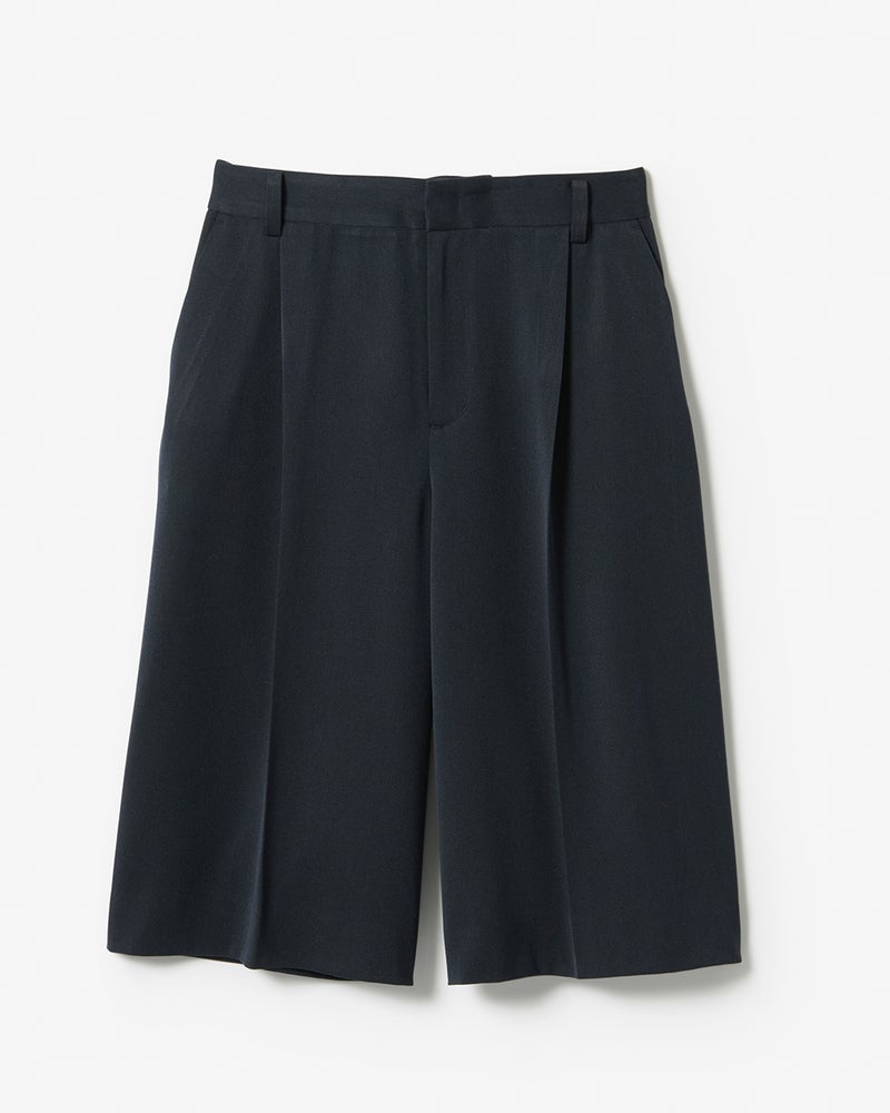 ブーツとのコーディネートに取り入れたい、大人のためのハーフパンツ。落ち感がきれいなヴィスコースに、ヴァージンウールをブレンドした上質素材。三子撚糸と呼ばれる3本の糸を撚り上げる技法により、艶感とハリのある表情に仕上げました。フロントにはセンタープレス、バックポケットにはゴールドボタンをあしらい、端正なデザインに。