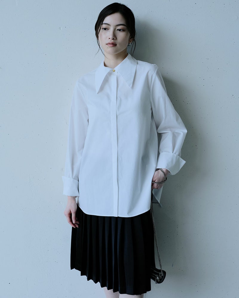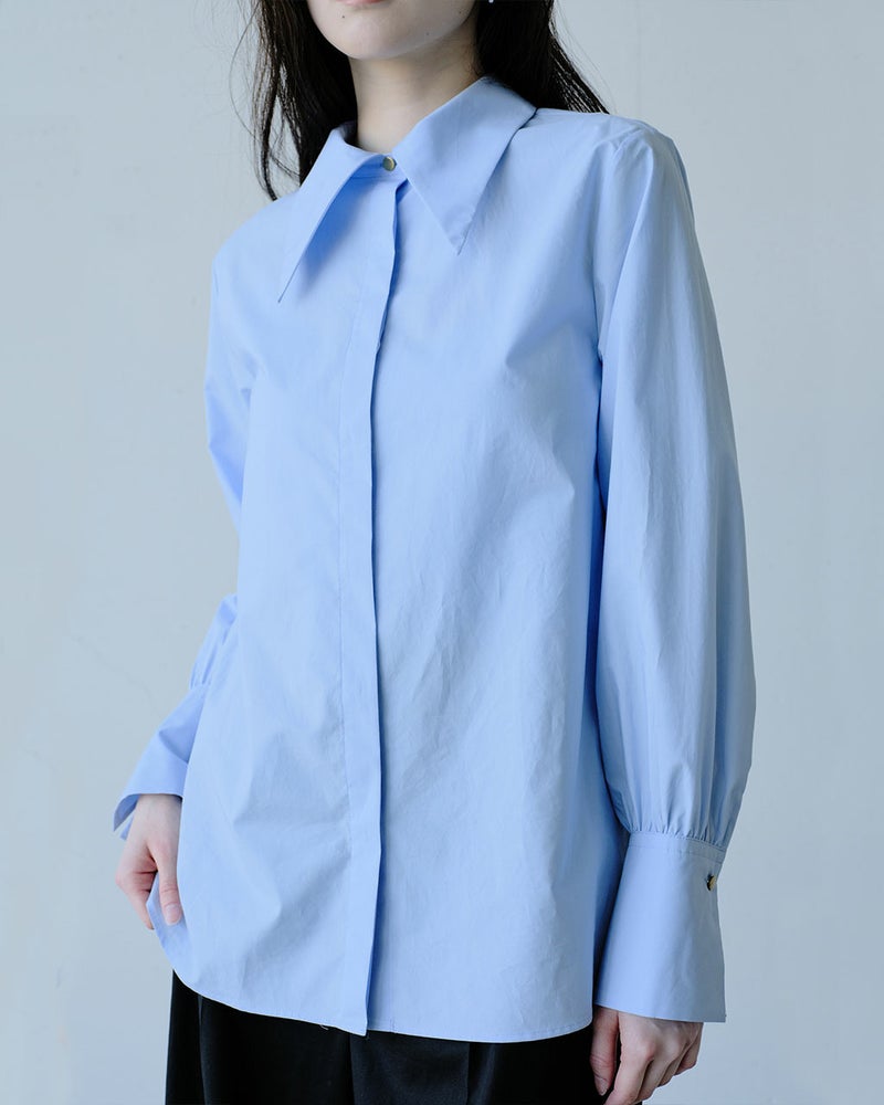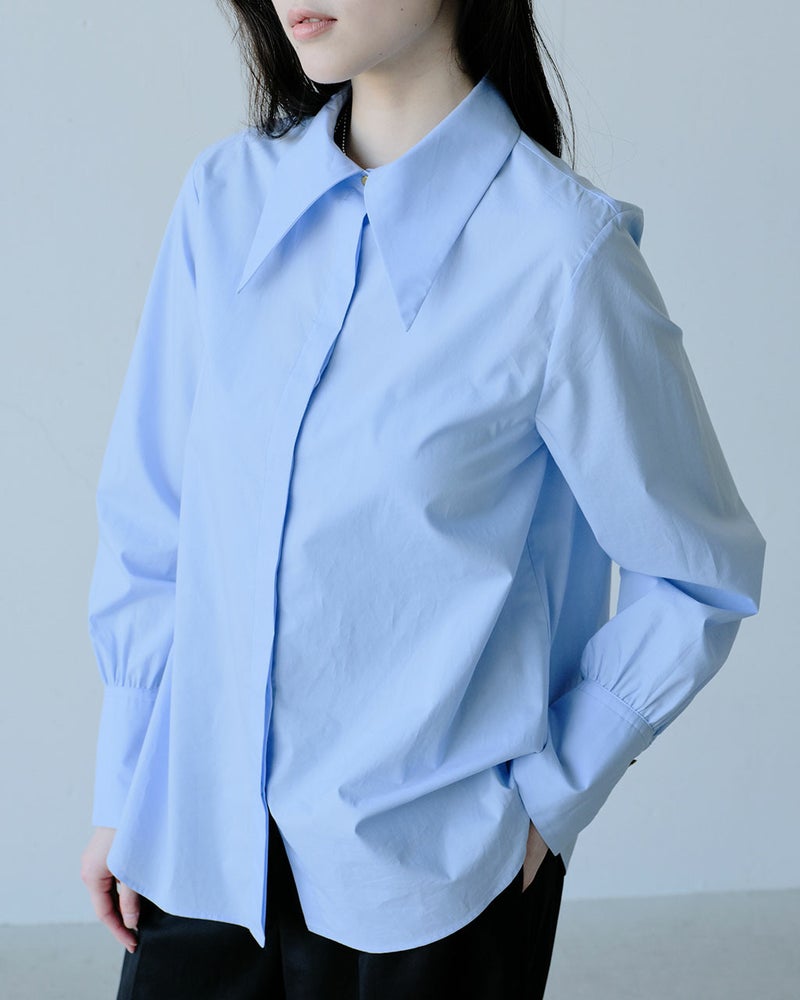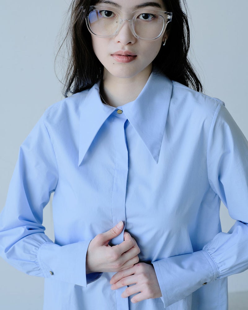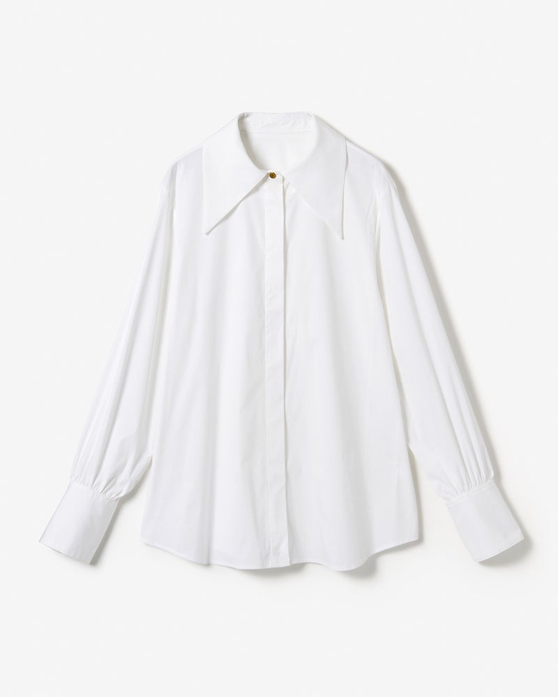 シンプルなのに華やか、旬のデザインなのにどこか懐かしい。細く繊細な120/2の綿糸を高密度に織り上げた、タイプライターコットン生地。ビッグカラーのクラシックなブラウスに仕立てました。袖のカフス部分も長めに仕上げ、たっぷりとギャザーをとって優美なシルエットを実現。オーバーブラウスでもタックインでも絵になる、絶妙な丈感。