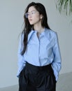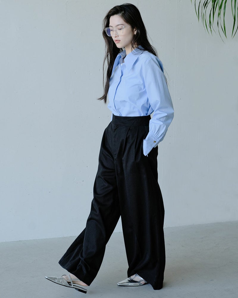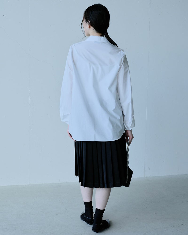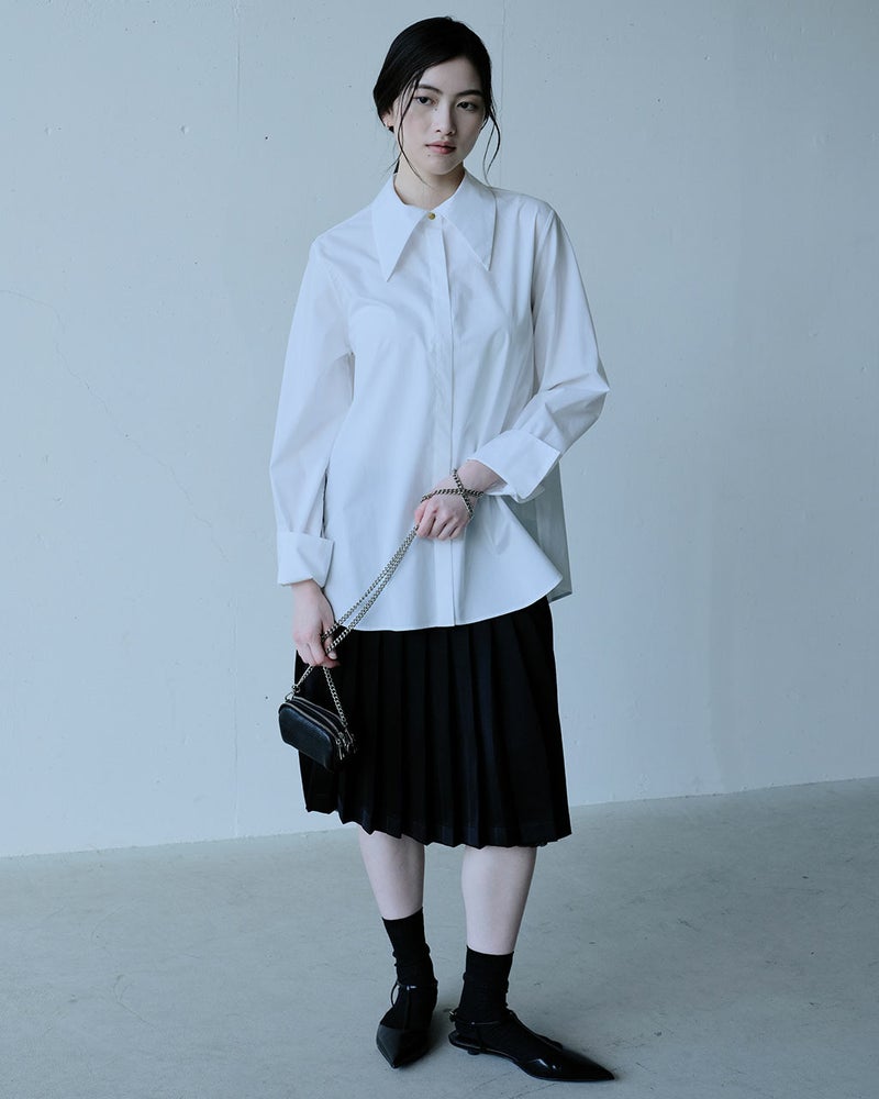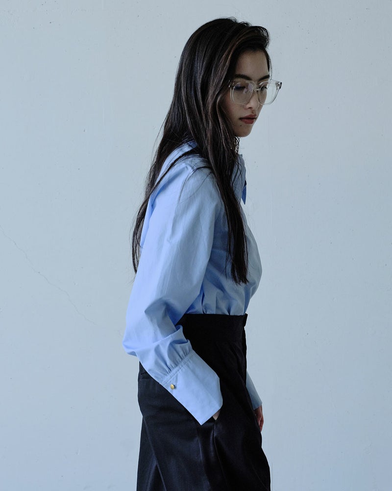 シンプルなのに華やか、旬のデザインなのにどこか懐かしい。細く繊細な120/2の綿糸を高密度に織り上げた、タイプライターコットン生地。ビッグカラーのクラシックなブラウスに仕立てました。袖のカフス部分も長めに仕上げ、たっぷりとギャザーをとって優美なシルエットを実現。オーバーブラウスでもタックインでも絵になる、絶妙な丈感。