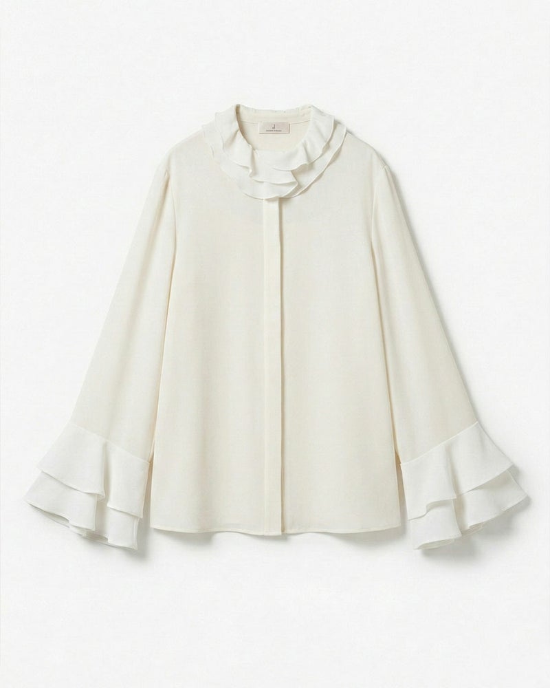とろみがあり透けにくいアセテート二重織り素材を使用した、ドラマティックなフリル袖のブラウス。衿もとにもフリルをあしらい、デイリーからオケージョンまで、幅広く使えるデザインに。1枚でもドレープが美しいシルエット、ジャケットやカーディガンを重ねても、衿や袖口からのぞくフリルが華やぎをプラス。