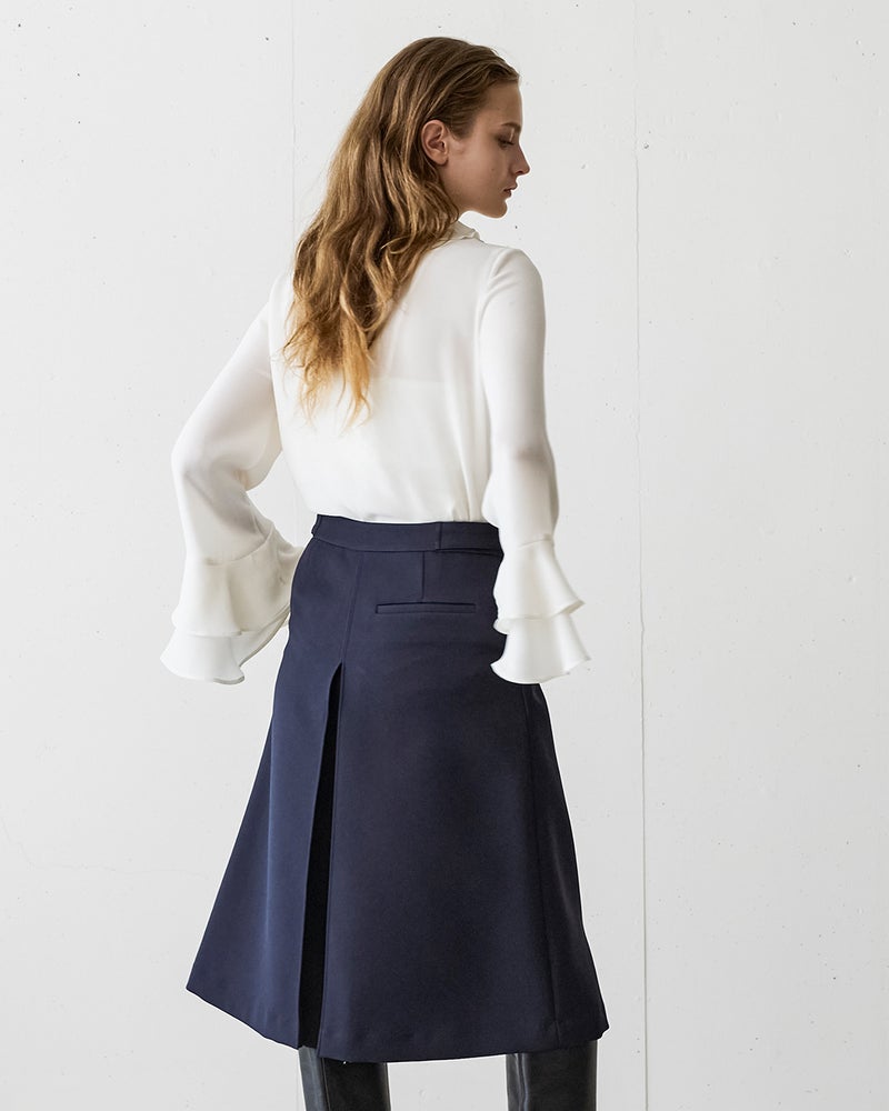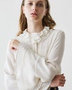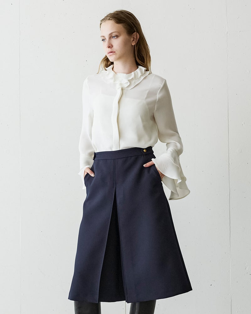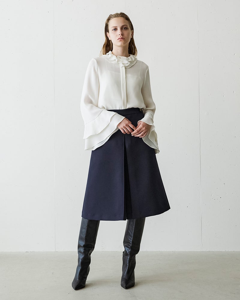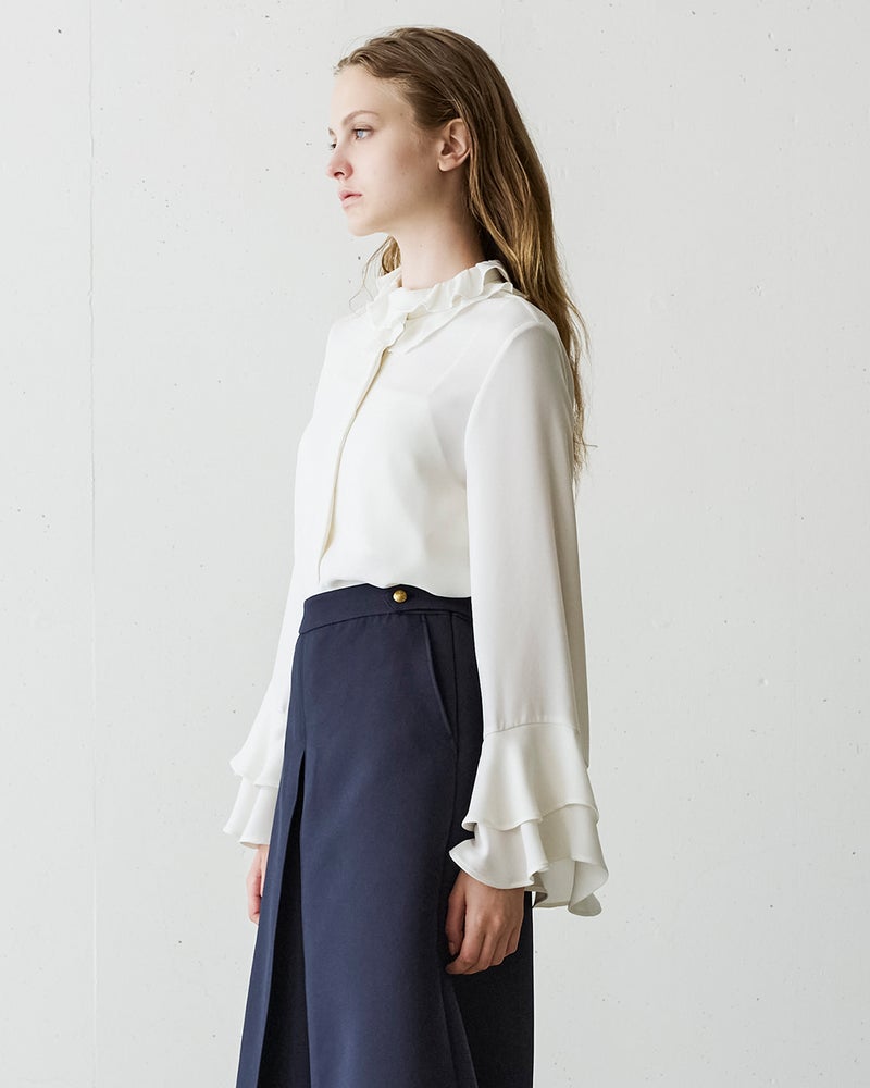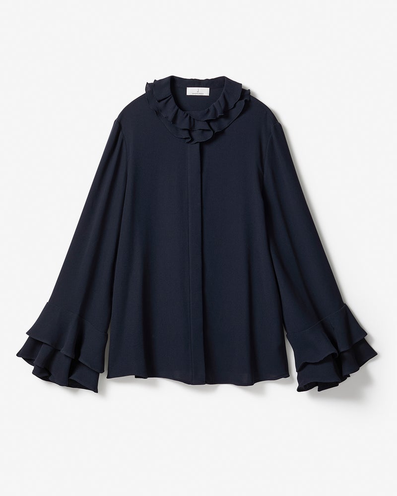 とろみがあり透けにくいアセテート二重織り素材を使用した、ドラマティックなフリル袖のブラウス。衿もとにもフリルをあしらい、デイリーからオケージョンまで、幅広く使えるデザインに。1枚でもドレープが美しいシルエット、ジャケットやカーディガンを重ねても、衿や袖口からのぞくフリルが華やぎをプラス。
