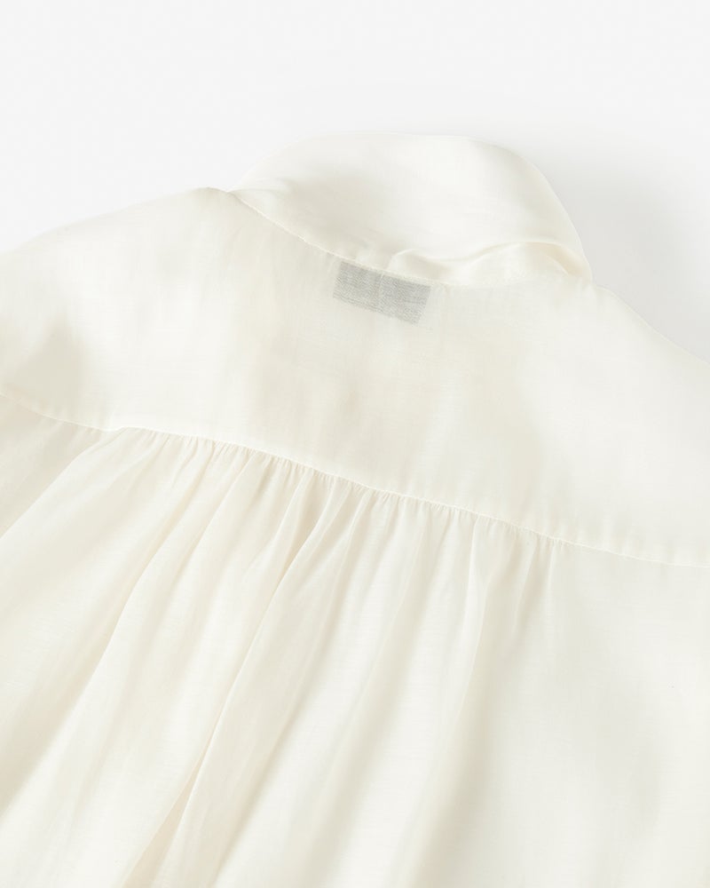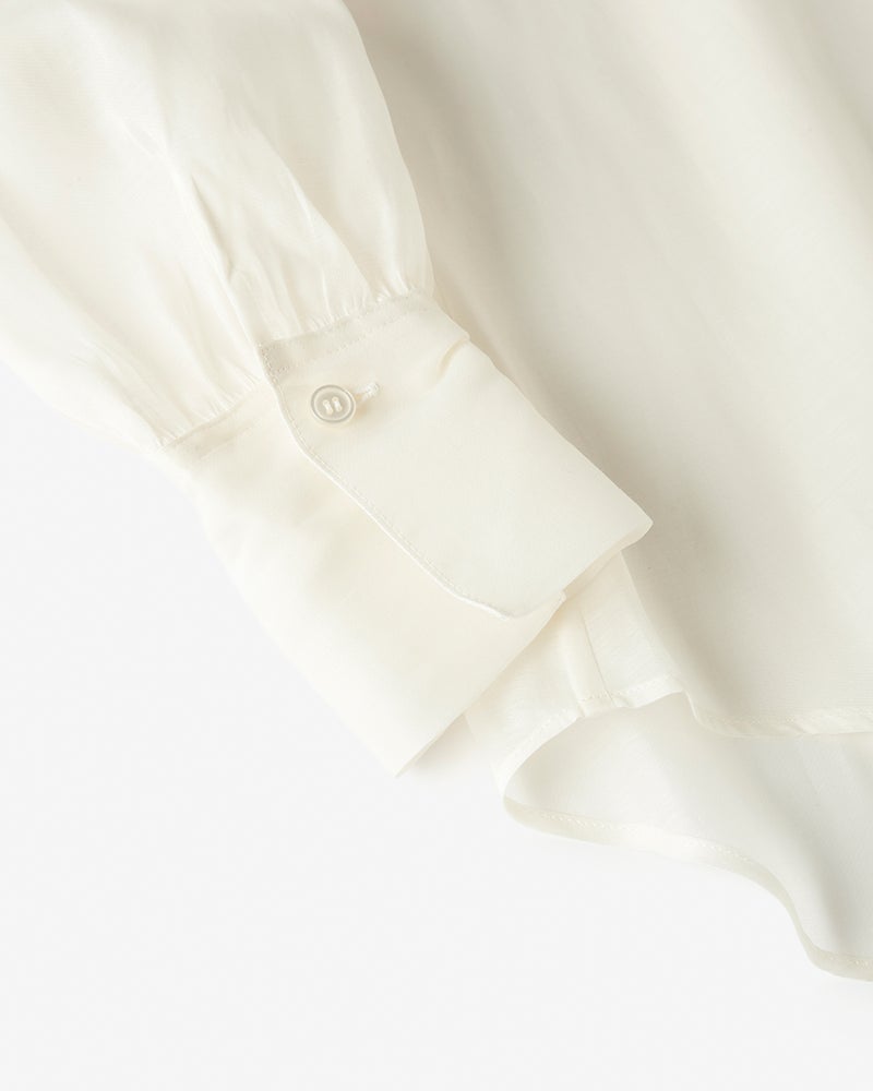 トレンドのシアーなブラウスは、シーズンレスに活躍するマストハブなアイテム。透け感の上品さが際立つ天然素材、コットンとシルクを交織したサテンオーガンジーを使い、フェミニンなボウタイスタイルに。一枚で着ても、ジャケットのインでも優美な存在感を放つ、美しいドレープのシルエット。ふだん使いはもちろん、オケージョンシーンにもおすすめ。