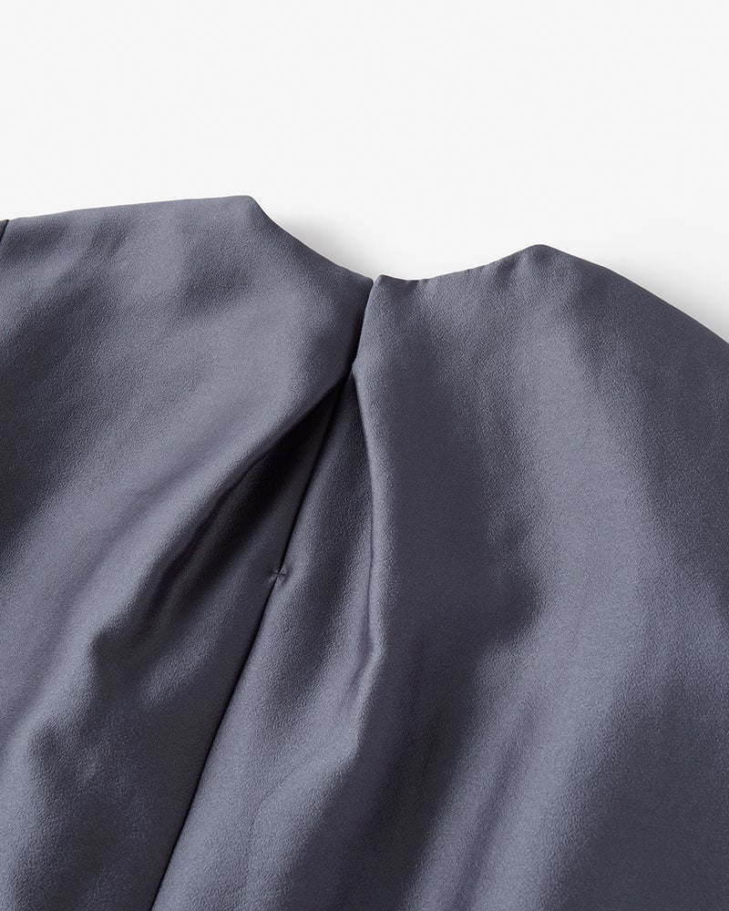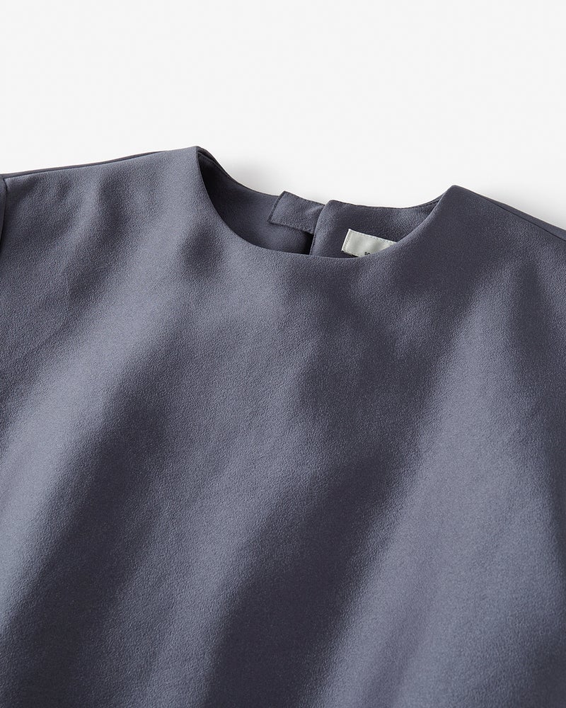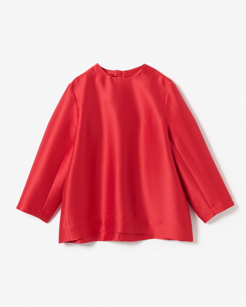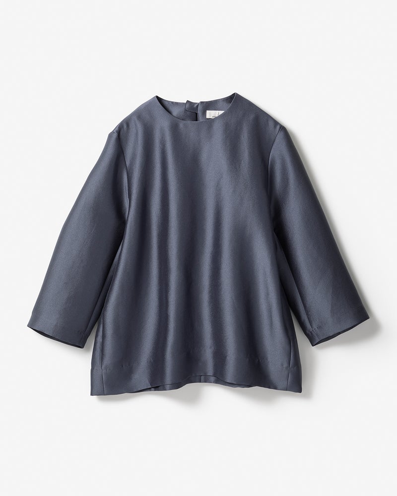 シルクのような光沢と軽やかさを併せ持つ、j.(ジェイドット)の定番素材、オクタダブルクロス。今回は季節や合わせるアイテムを選ばない、プレーンな七分袖ブラウスに。フロントはボックスシルエット、背中部分にはタックを入れたコクーンシルエットで、オクタダブルクロスならではの構築性のあるデザインに。はっとするような発色の美しさも魅力。