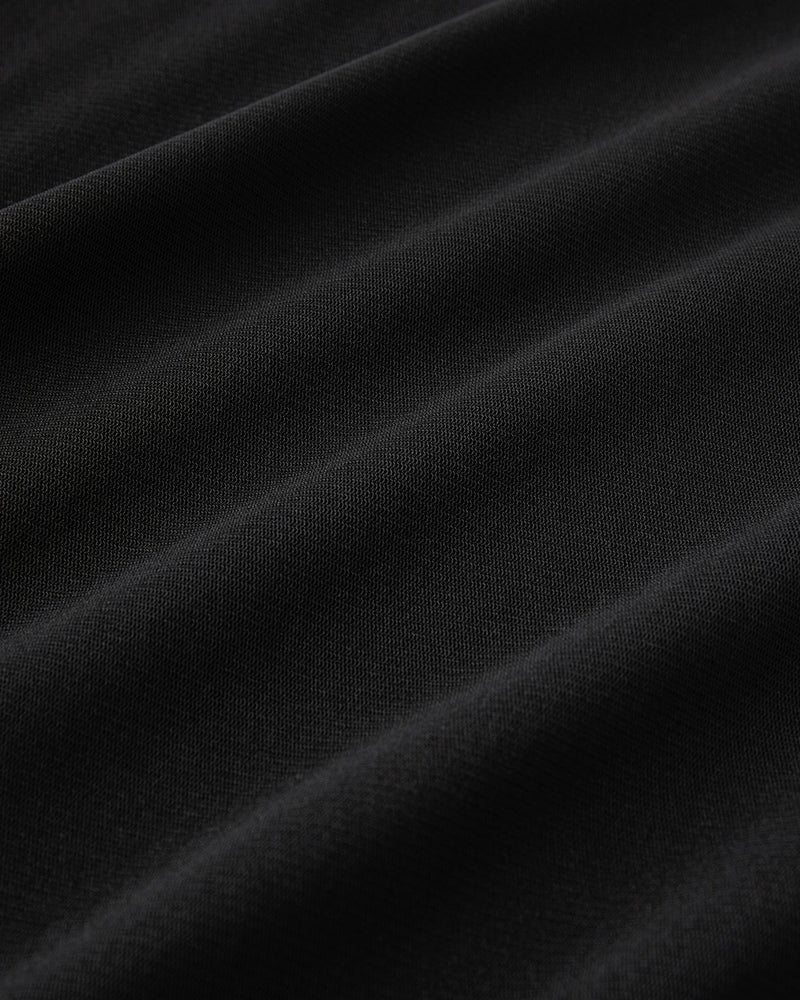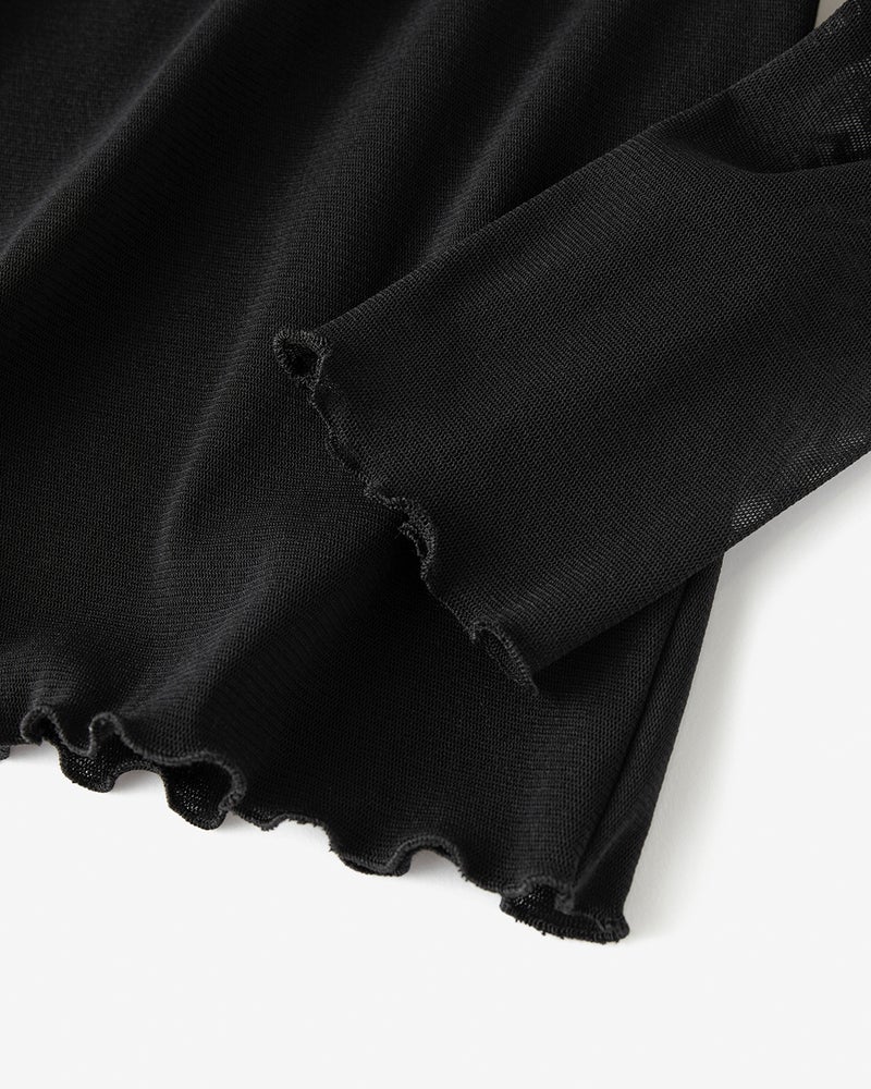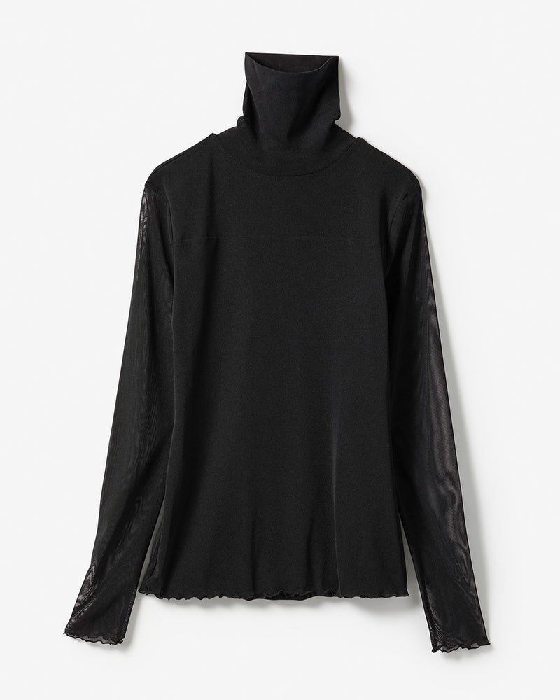 単品で着てもシックな印象。シャツやニットの中に合わせても、黒のアクセントを効かせつつ、もたつかずすっきりと着こなせる上品ハイネックトップス。胸下からは2枚重ねの切り替えで、デコルテのみオーガンジーのシアー感を楽しめるデザインに。ストレッチの効いたサモーラ糸を使用し、繊細な透け感とのびやかな肌あたりのよさを両立。
