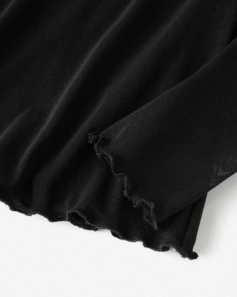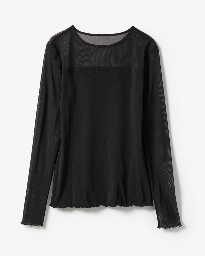 大人女性のボディの曲線を綺麗にひき立てる上品トップス。胸下からは2枚重ねの切り替えで、デコルテのみオーガンジーのシアー感を楽しめるデザインに。ストレッチ性に富んだサモーラ糸を使用し、繊細な透け感とのびやかな肌あたりのよさを両立。ジャケットのインに合わせてもすっきりまとまるクルーネック。