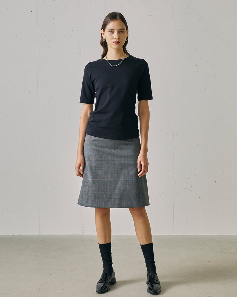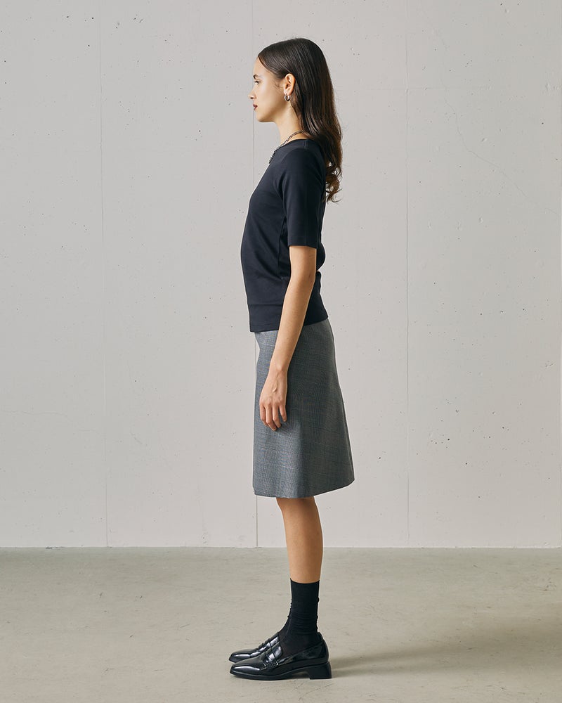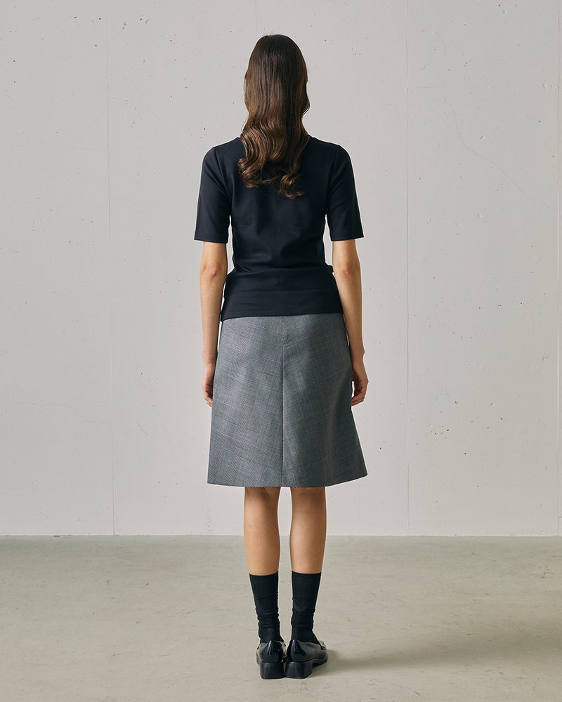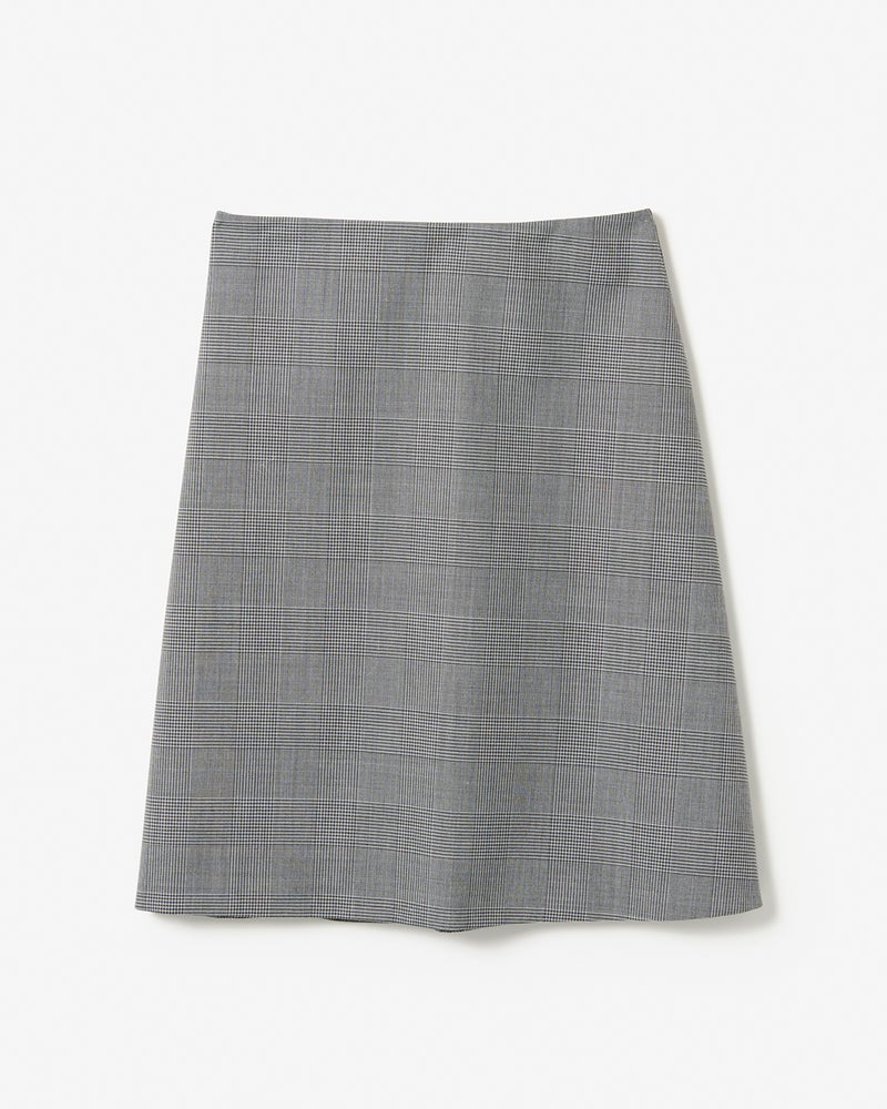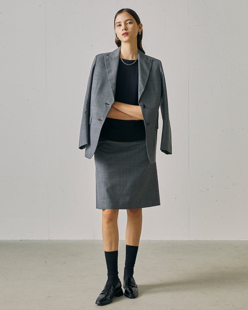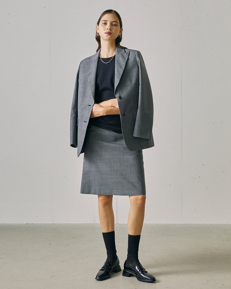 コンパクトなショートレングスのスカートは、ロングブーツとも相性がよく膝下をスマートに見せる、実は大人世代に最適なアイテム。ほんのりAラインのシルエットで、立体的に仕立てました。素材は世界のメゾンにも生地を提供するイタリアの名門生地ファクトリーから届いた、選りすぐりのウール混ポリエステル。ジェントルシックなグレンチェック柄だから、どんなアイテムを合わせてもハンサムな表情に。同素材のシングルジャケット(14660)と合わせるのもおすすめ。