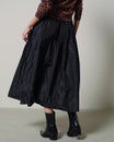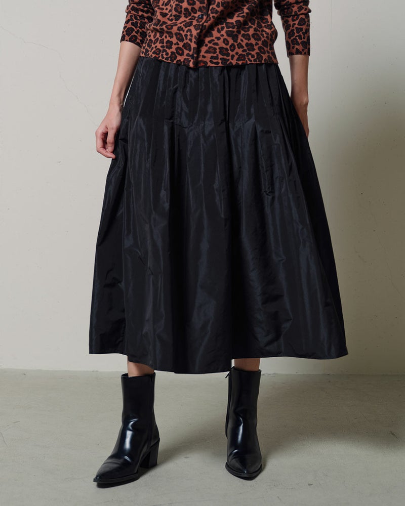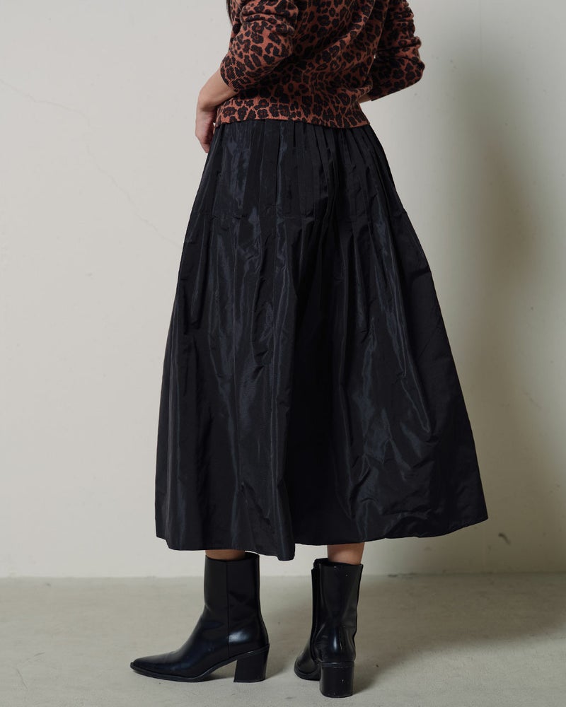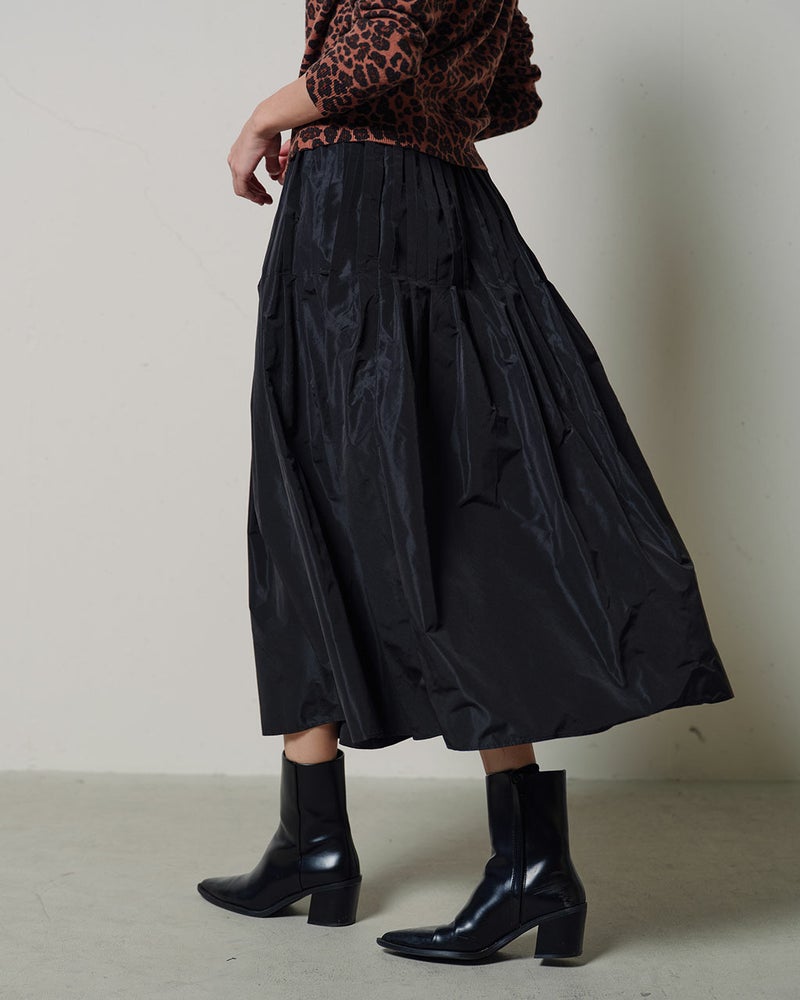 ドラマティックなボリューム感とほのかな光沢を両立したフレアスカートは、日常のお出かけにもちょっとしたパーティにも似合う万能アイテム。ハイブランドでも人気を博す上質な国産タフタ素材は、薄手ながらハリのある質感で構築的なシルエットとシワになりにくい機能性も兼ね備えた上質素材。ウエストから腰まわりにかけて細かなタックを入れることで、すっきりスマートに着こなせる工夫も取り入れています。