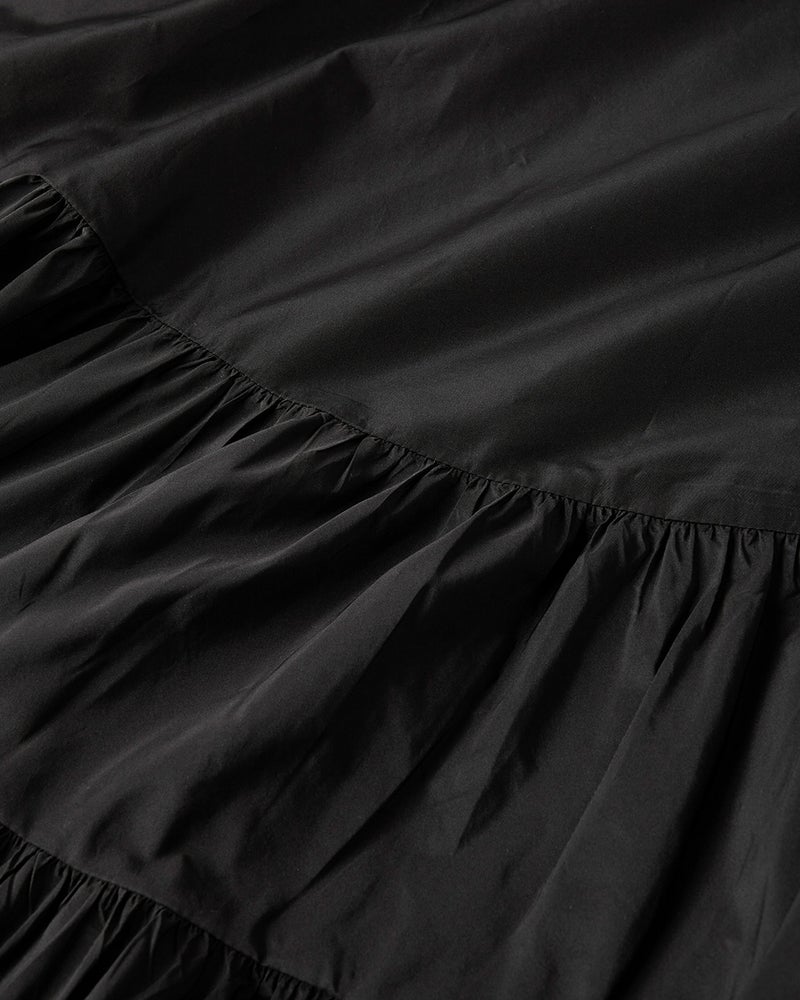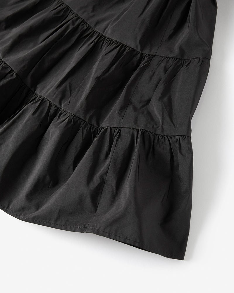 ボリュームニットと合わせて日常使いに、ジャケットを羽織ればオケージョンシーンにもふさわしいラグジュアリー感。メゾンブランドでも用いられるテクニカルタフタは、ほどよい光沢とハリがあり、軽やかな着心地。ティアードの切り替え位置に至るまで、大人の体型をより美しくスマートに見せる発想が詰まった一枚。