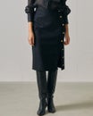 知性と女性らしさが共存するストレートシルエットのミディスカート。ボリュームのあるニットに合わせてバランスをとったり、ロングブーツでスマートなIラインシルエットに仕上げたり、さまざまなコーディネイトに活躍するシンプルでありながら「今」の気分も兼ね備えた1着。素材はSuper140'sの上質ウール素材に伸縮性をもたせた尾州産のウールジャージー素材。金ボタンで開閉可能のサイドスリットは、開いて軽やかに、閉じて上品にと、その日の着こなしに合わせて調節できます。