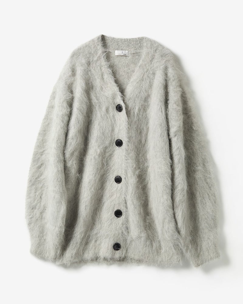 触れるだけで気分が癒される、エアリーなぬくもり。最高級といわれるスーリーアルパカを紡績し、丁寧にブラッシングしたヘアリーなニット。ゆったりしたシルエットのVネックカーディガンは、気負わず羽織れるのにカジュアルになりすぎず、ボディを華奢に見せる効果も。