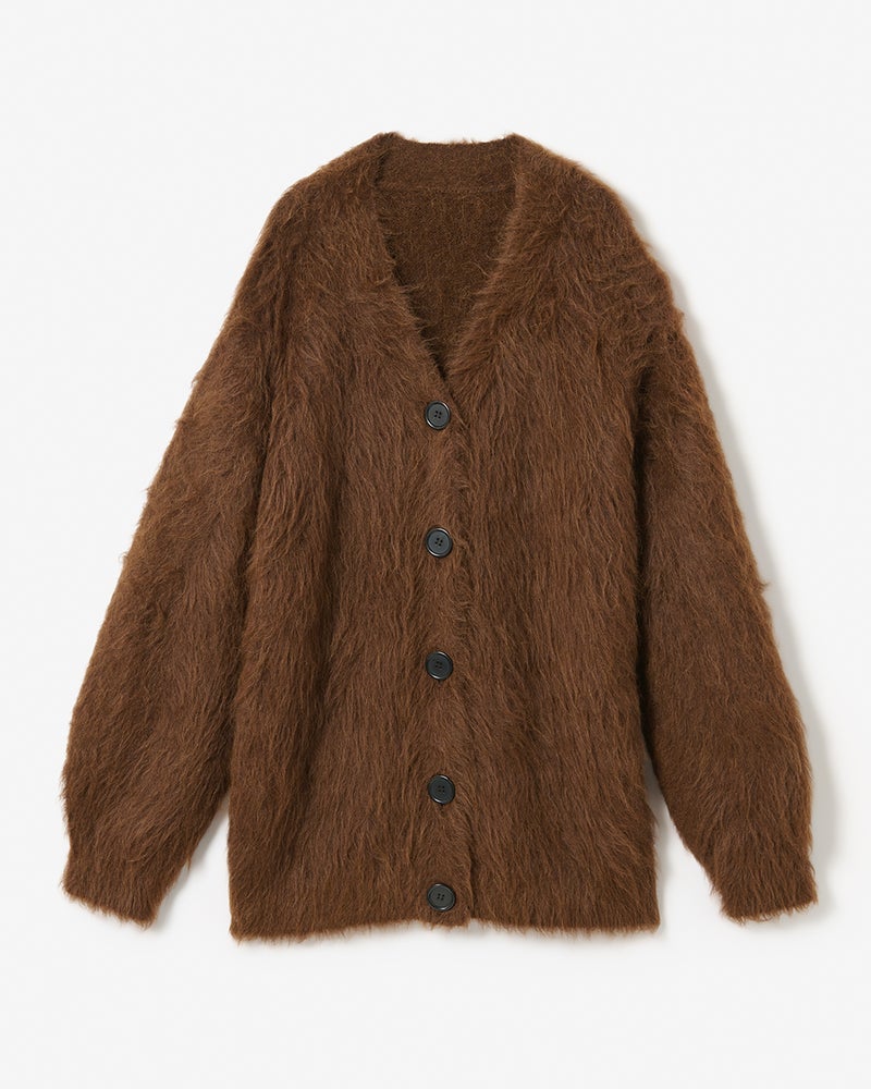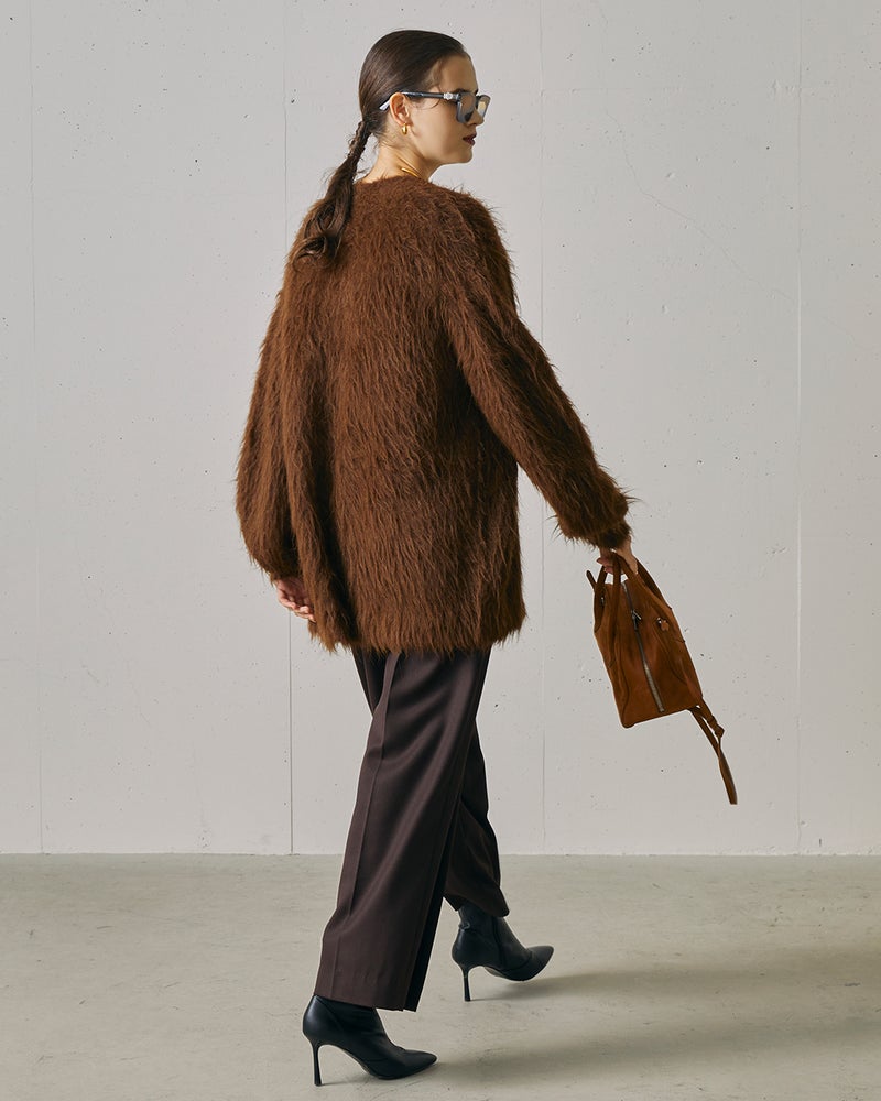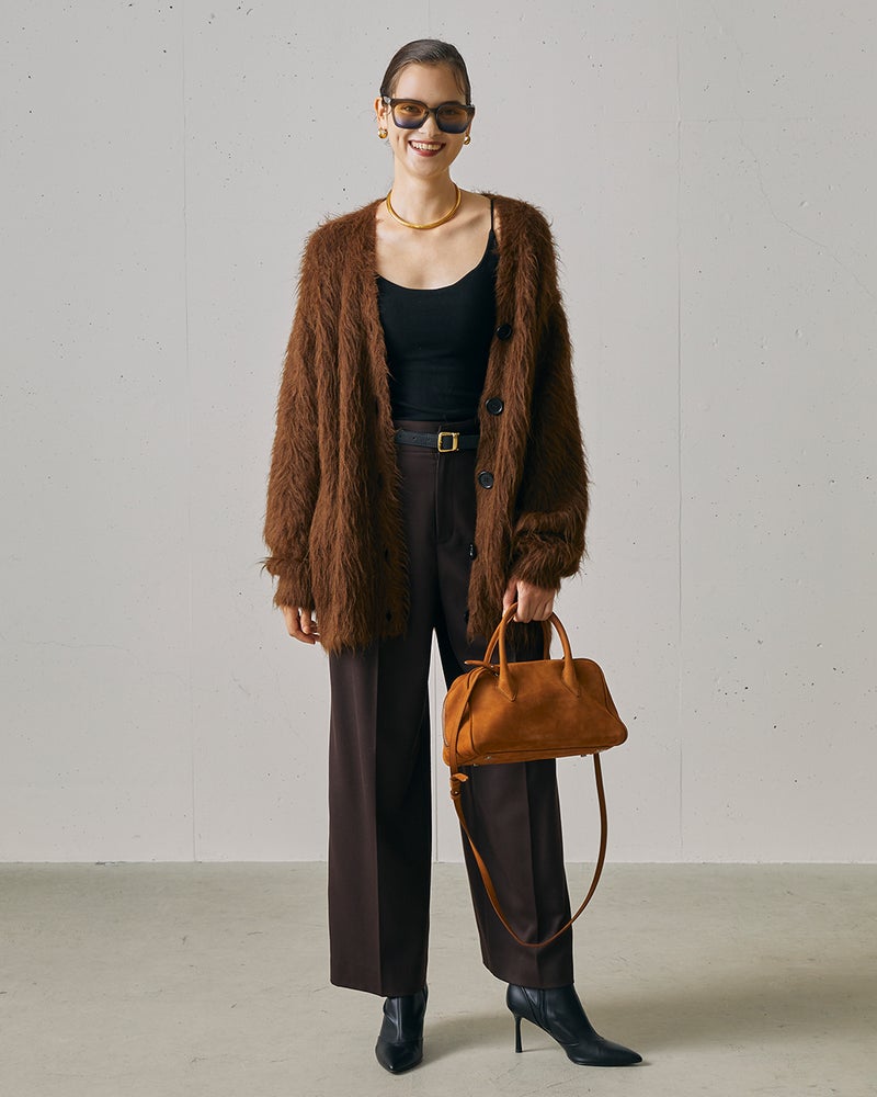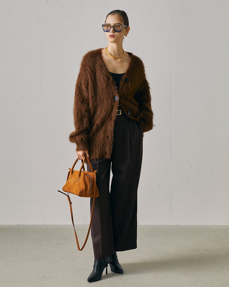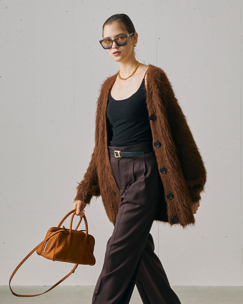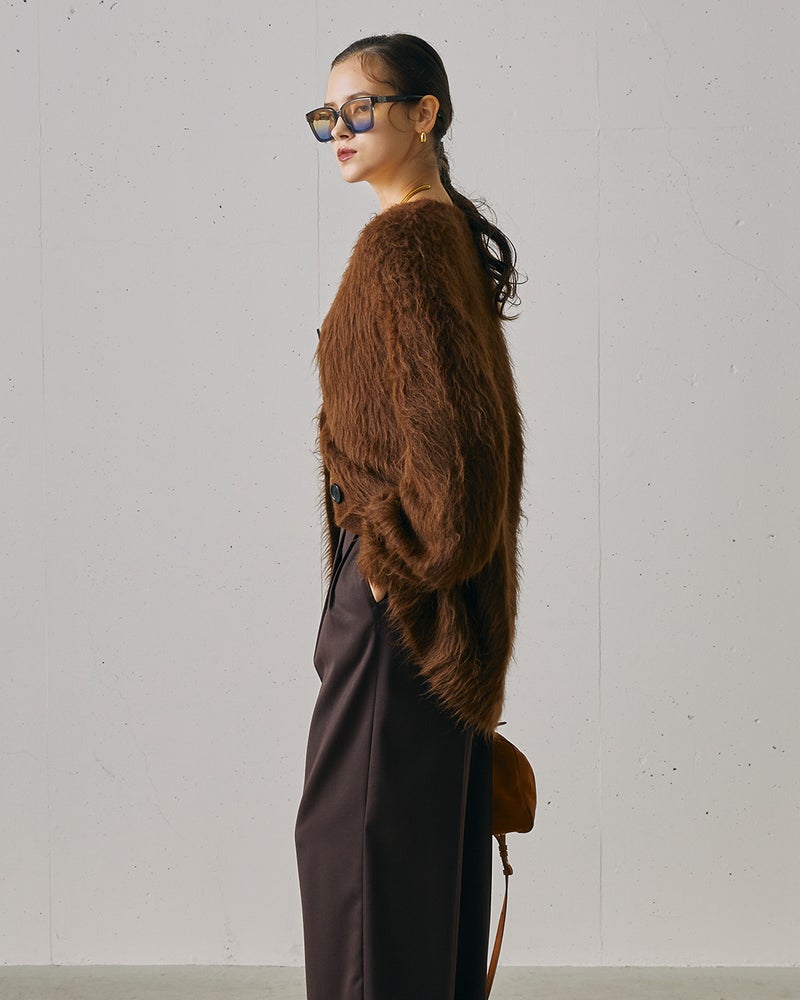 触れるだけで気分が癒される、エアリーなぬくもり。最高級といわれるスーリーアルパカを紡績し、丁寧にブラッシングしたヘアリーなニット。ゆったりしたシルエットのVネックカーディガンは、気負わず羽織れるのにカジュアルになりすぎず、ボディを華奢に見せる効果も。