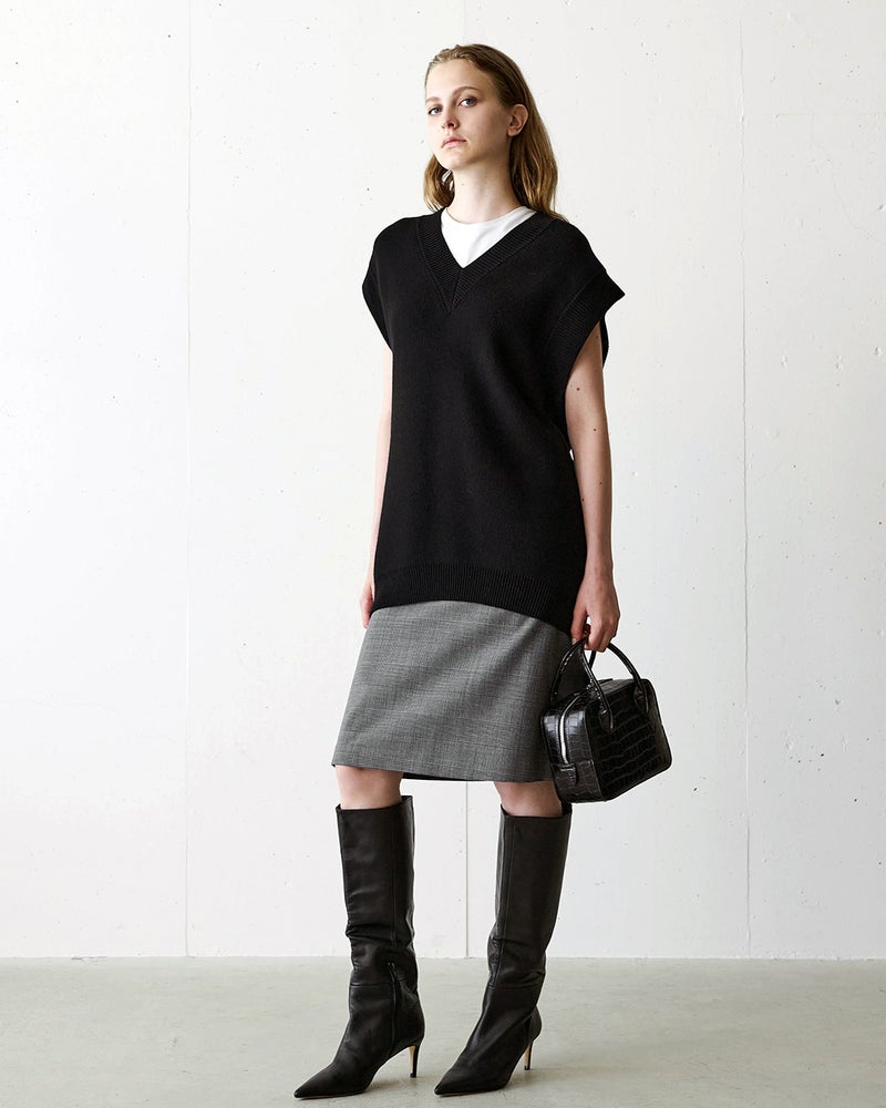 着るだけで旬の空気をまとえるニットベスト。アームホールを広めにとり、たっぷりとしたオーバーサイズのフォルムに。ヒップまで隠れる丈感で、体型カバー効果も。シルケット加工を施した極細糸の『ウルトラファインメリノウール』は、まるでカシミヤのような柔らかくやさしい肌触りを実現。深すぎない開きのVネックが、オーセンティックな着こなしを叶える1着。