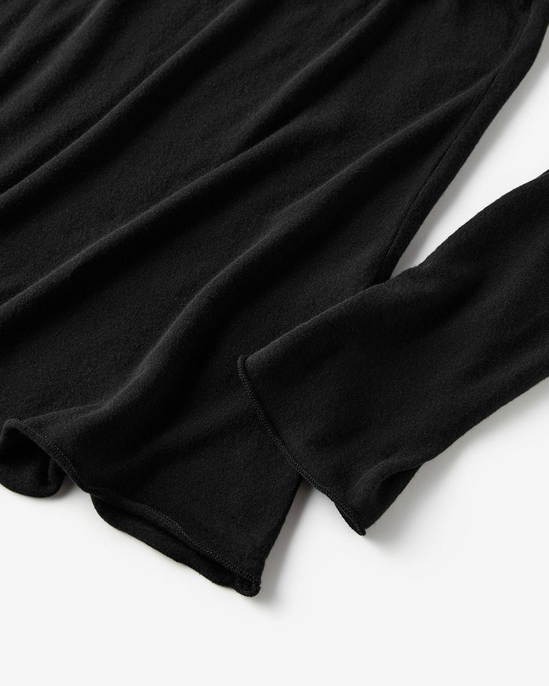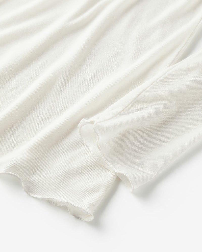 素材は極細糸を編みたててほんのりシアーな質感に仕上げたカシミヤシルク混。ほどよい保温性、吸湿性、そしてふんわり柔らかでちくちくしにくい質感で、毎日着たくなる心地よさ。