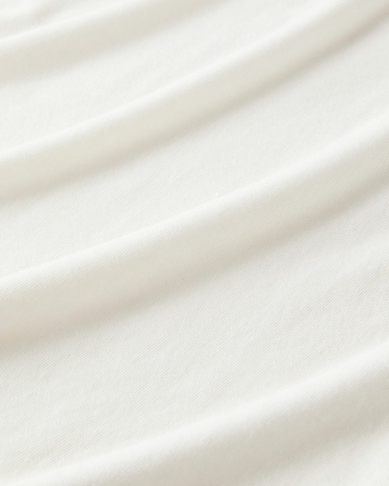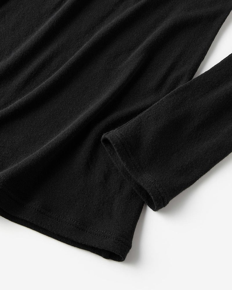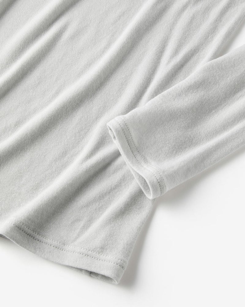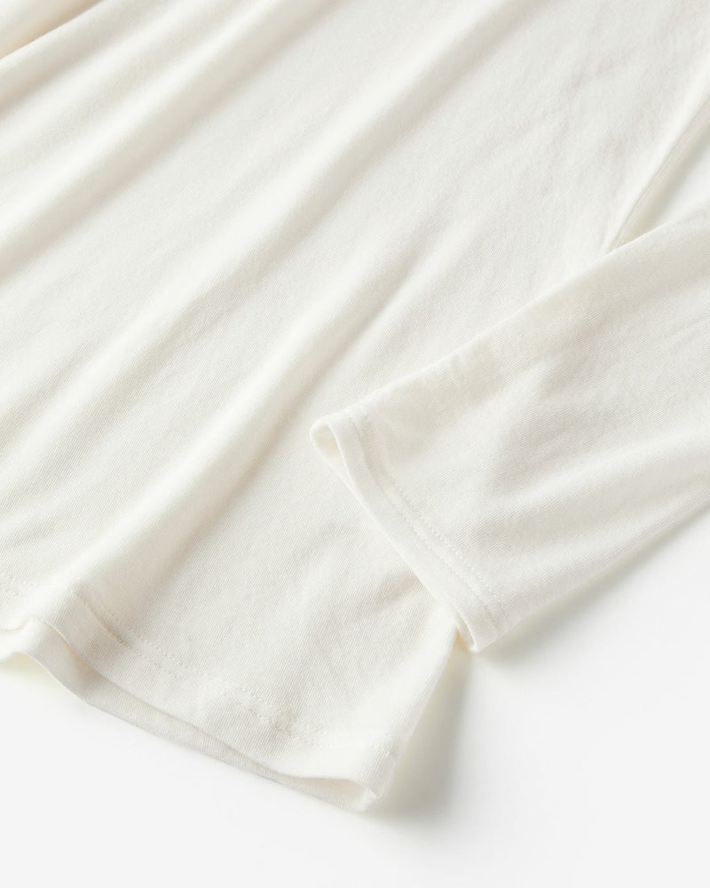 素材は極細糸を編みたててほんのりシアーな質感に仕上げたカシミヤシルク混。ほどよい保温性、吸湿性、そしてふんわり柔らかでちくちくしにくい質感で、毎日着たくなる心地よさ。