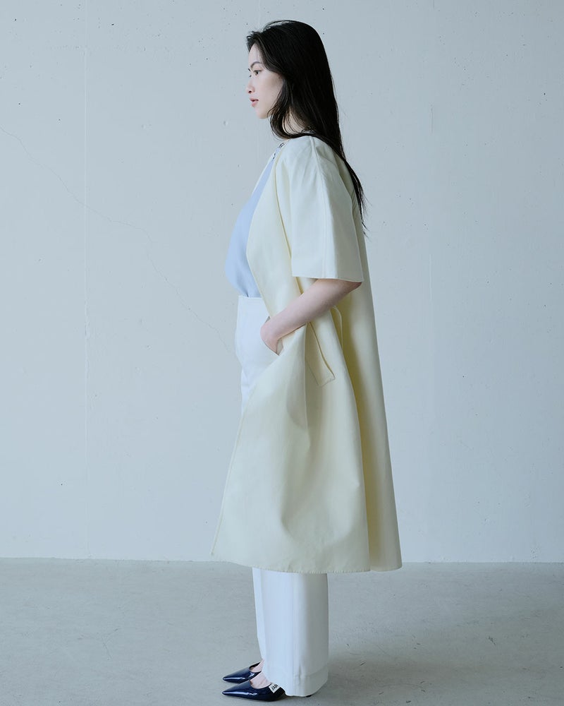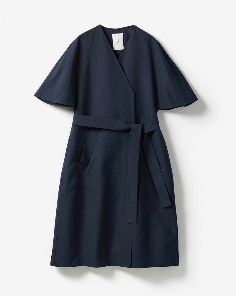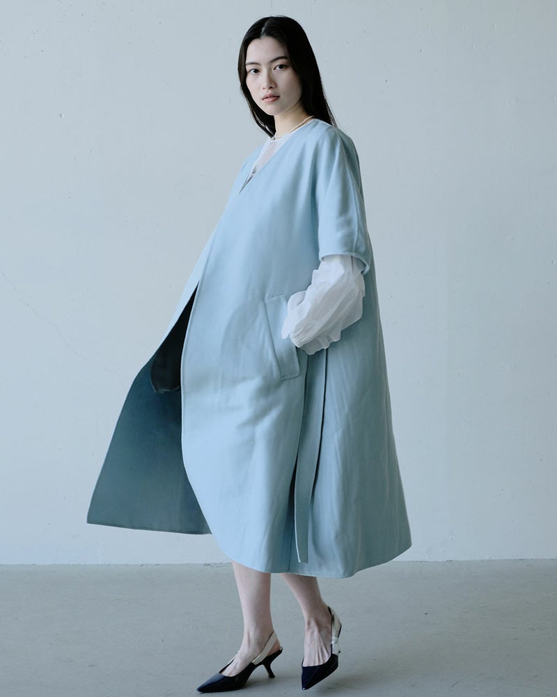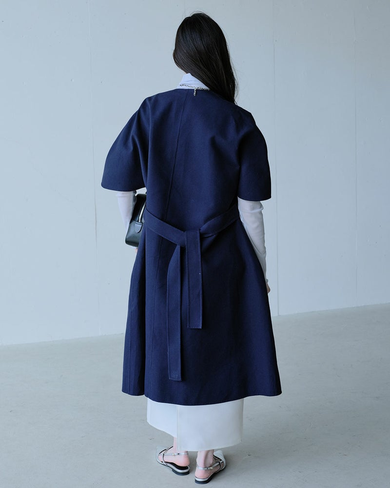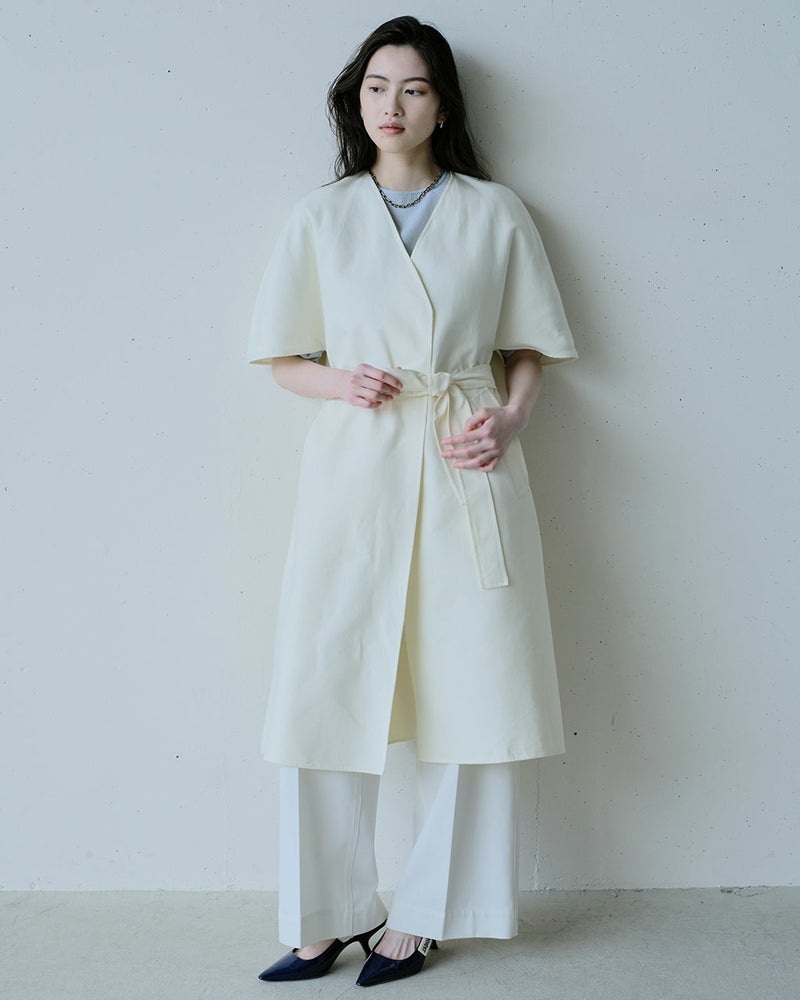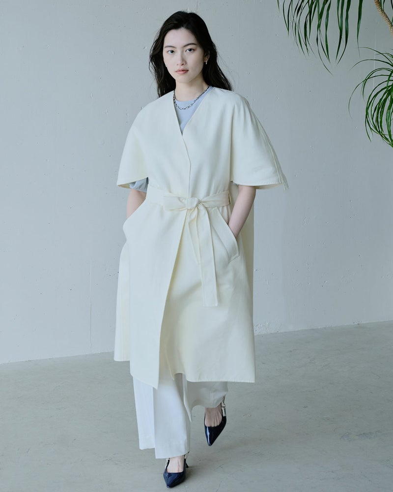 コートの袖を短めにデザインした、モードなシルエット。シチュエーションや季節にとらわれない、自由なコーディネートが楽しめる1着。コットン混のダブルフェイス素材は、ハリと厚みがありながら驚くほど軽い着心地。柔らかな発色もシックな印象。ノーボタン、共布ベルト付きで、前を開けた羽織りと、ベルトでウエストマークするのとでは、それぞれ異なる表情の着こなしに。