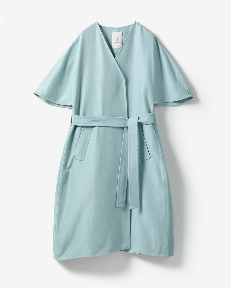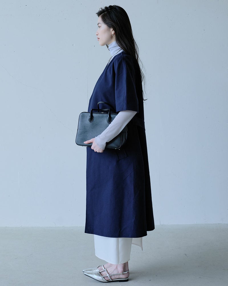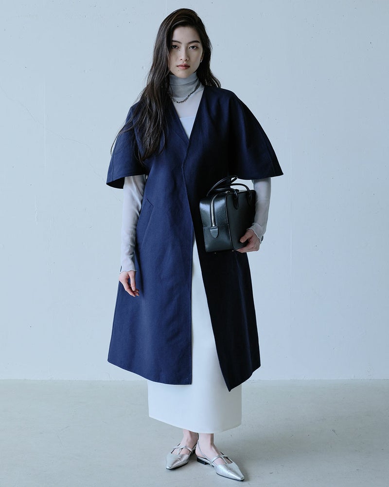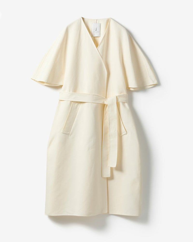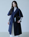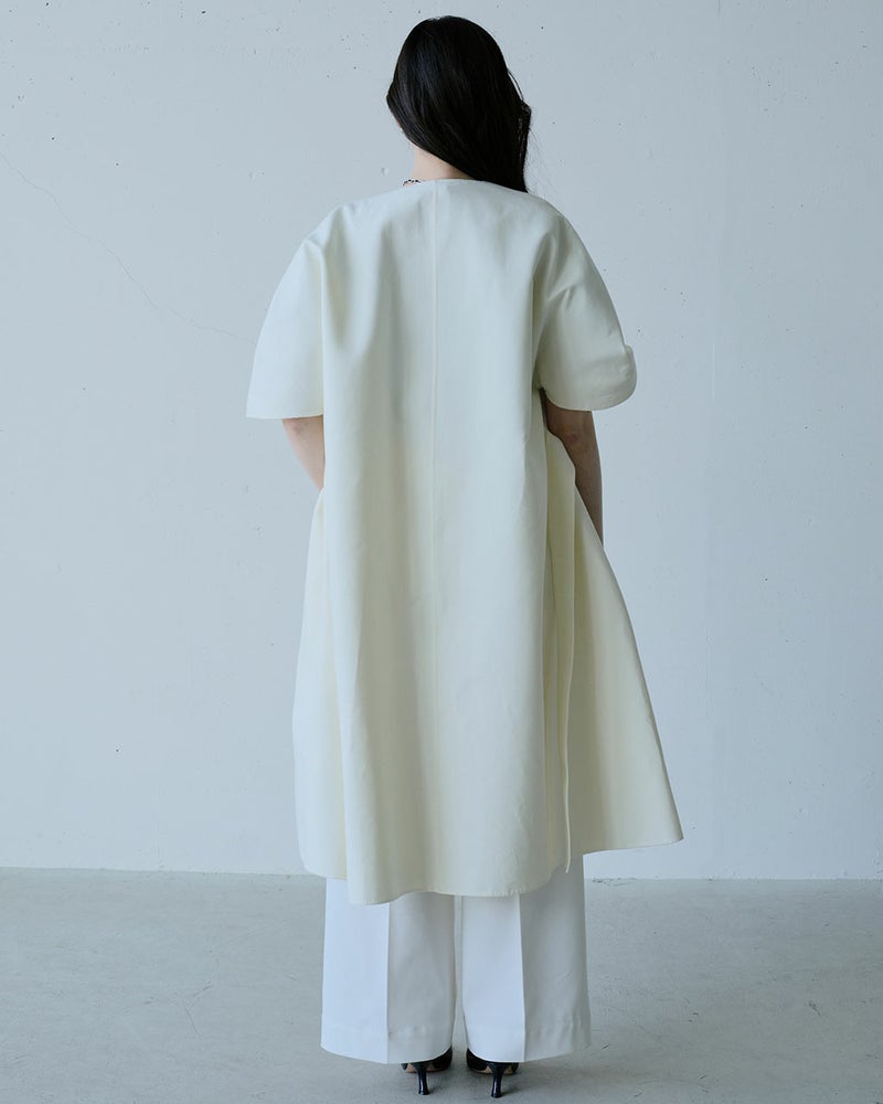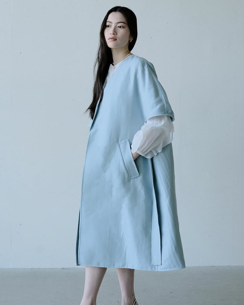 コートの袖を短めにデザインした、モードなシルエット。シチュエーションや季節にとらわれない、自由なコーディネートが楽しめる1着。コットン混のダブルフェイス素材は、ハリと厚みがありながら驚くほど軽い着心地。柔らかな発色もシックな印象。ノーボタン、共布ベルト付きで、前を開けた羽織りと、ベルトでウエストマークするのとでは、それぞれ異なる表情の着こなしに。