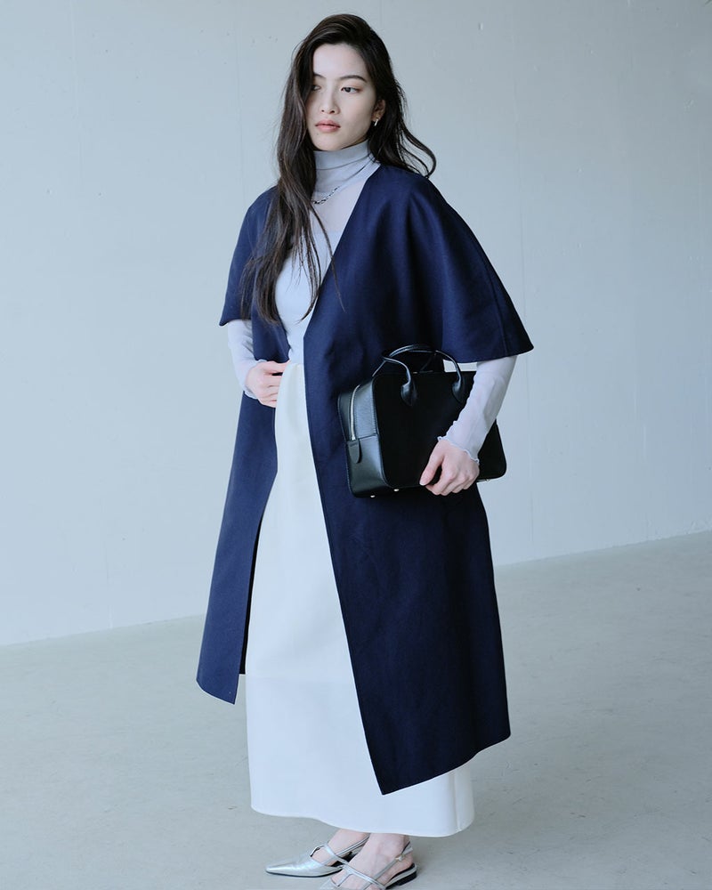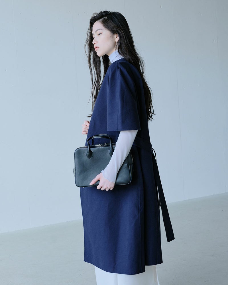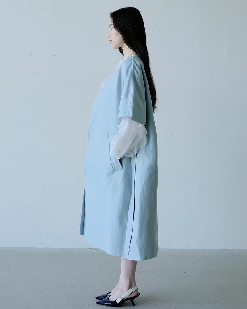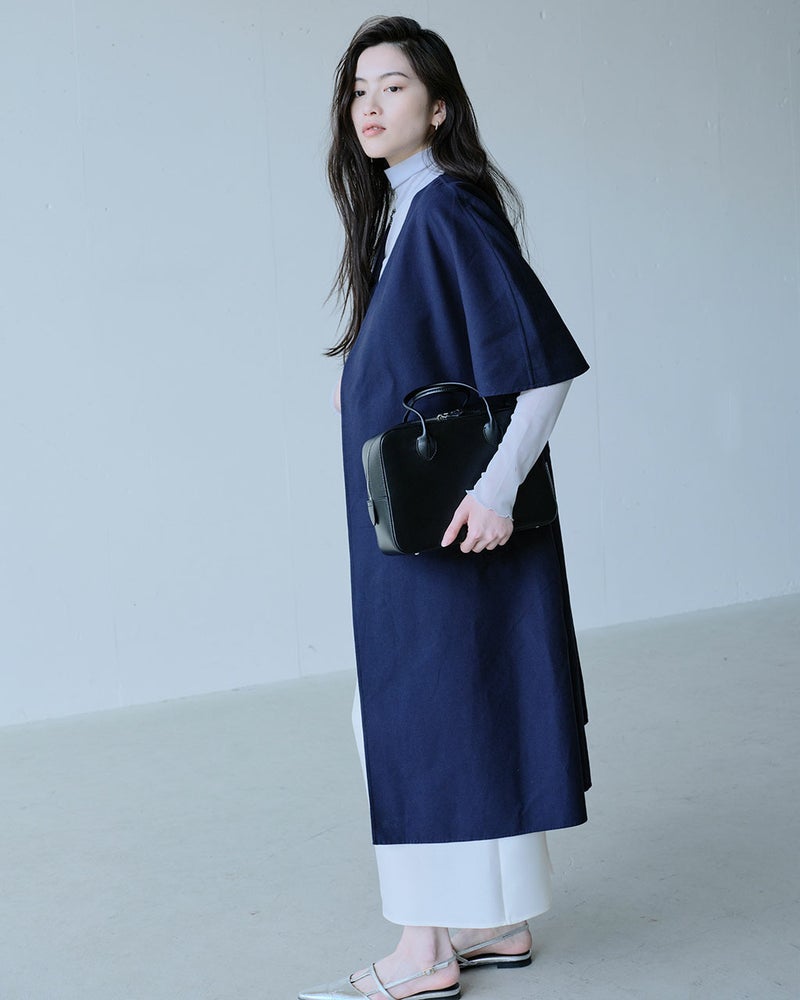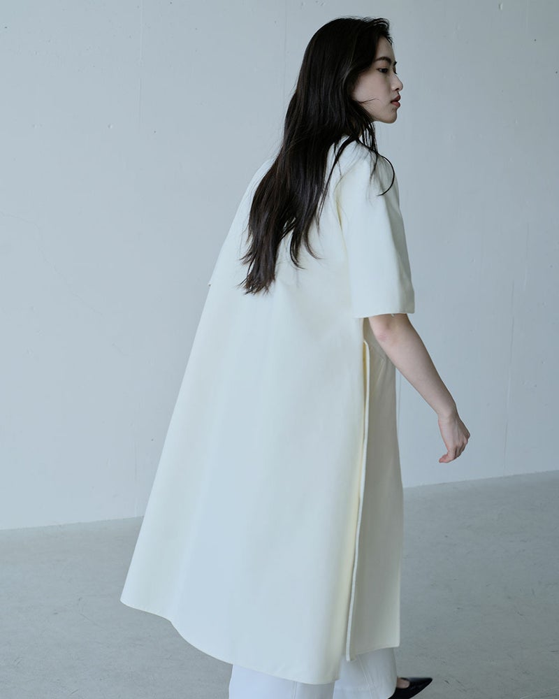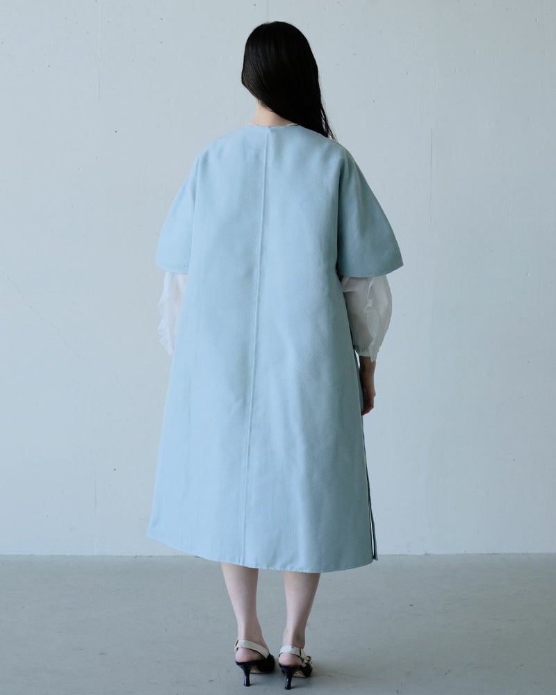 コートの袖を短めにデザインした、モードなシルエット。シチュエーションや季節にとらわれない、自由なコーディネートが楽しめる1着。コットン混のダブルフェイス素材は、ハリと厚みがありながら驚くほど軽い着心地。柔らかな発色もシックな印象。ノーボタン、共布ベルト付きで、前を開けた羽織りと、ベルトでウエストマークするのとでは、それぞれ異なる表情の着こなしに。