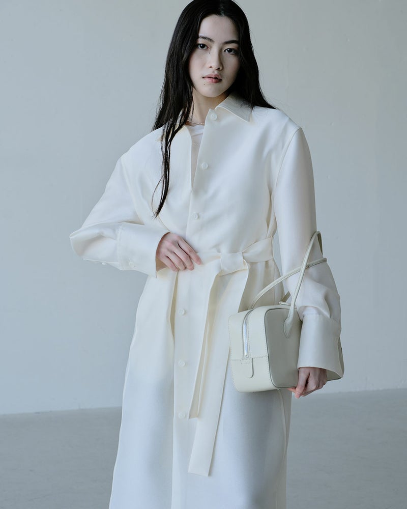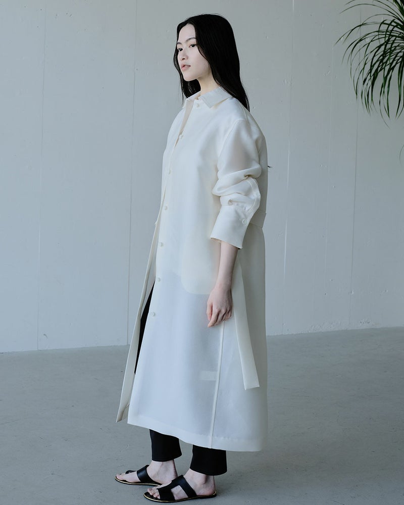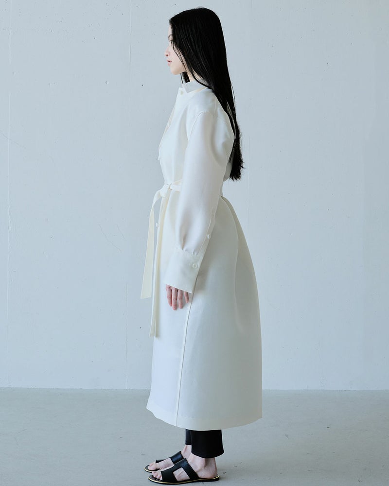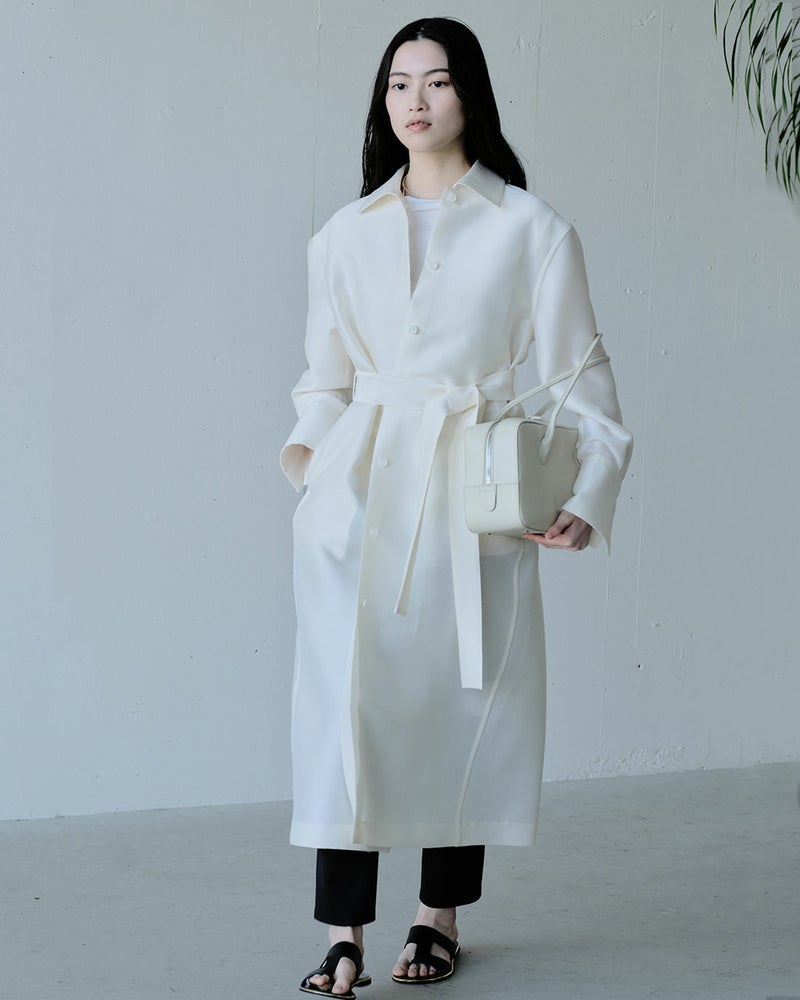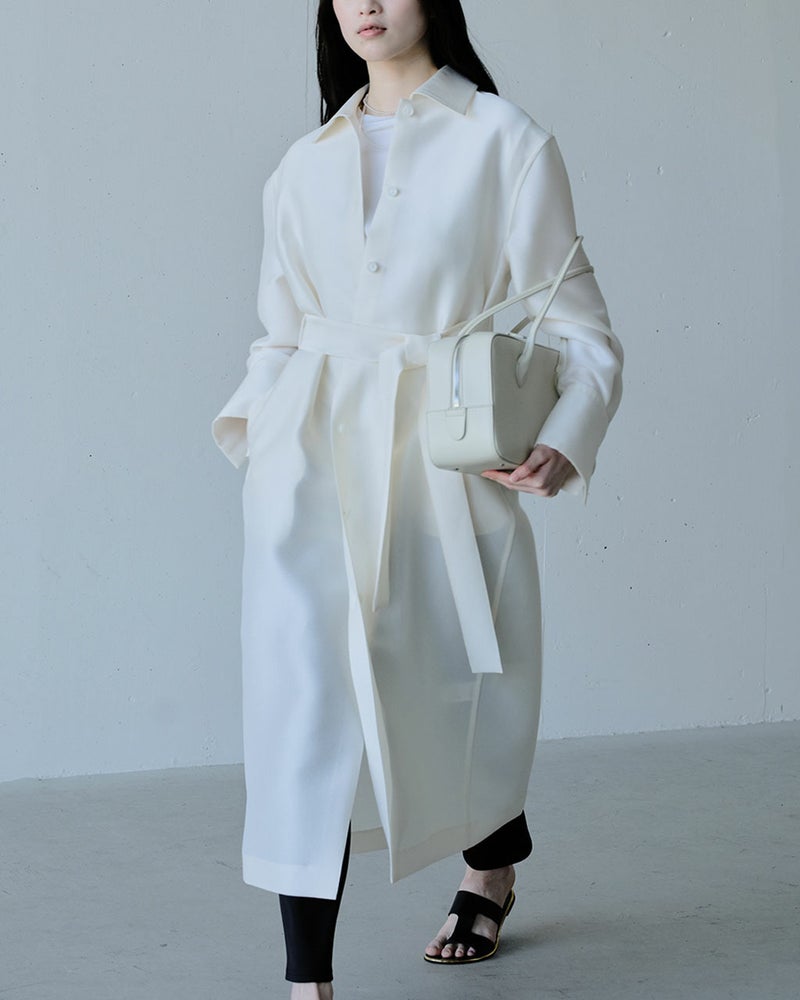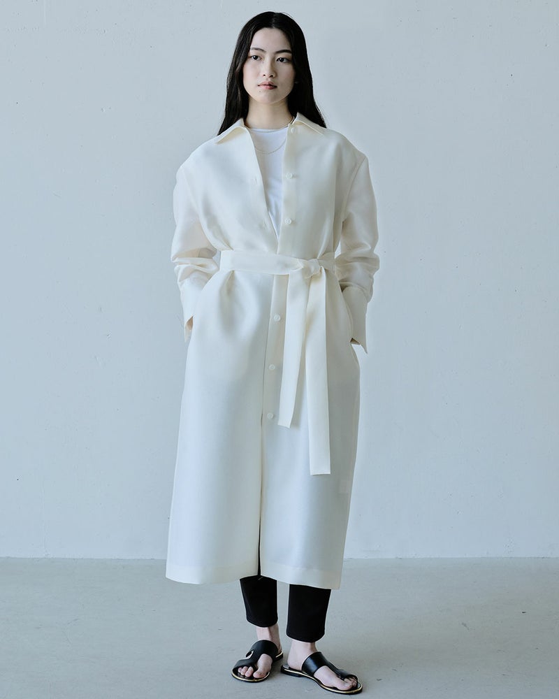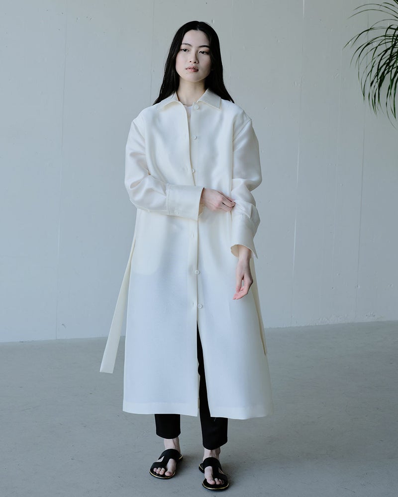 1枚でシャツワンピースのようにも着られるうえ、いつものスタイルにさっと羽織るだけで、スタイリッシュなたたずまいがつくれるドレスコート。共布ベルト付きで、着こなしのアレンジも自在。シンプルなデザインなのに、目をひく力があるのは、多くのトップメゾンから指名される日本生まれの名品素材、オクタダブルクロスだから。中空糸特有の羽根のような軽さとシルキーな艶、フォルムをしっかりと形成する構築性。染色前には本物の絹と同様の前処理を行うなど、“未来のシルク”の名にふさわしい質感を追求。
