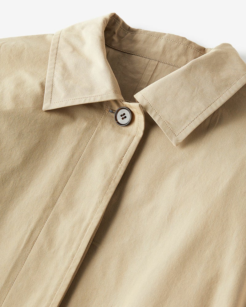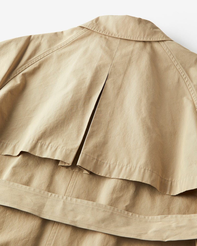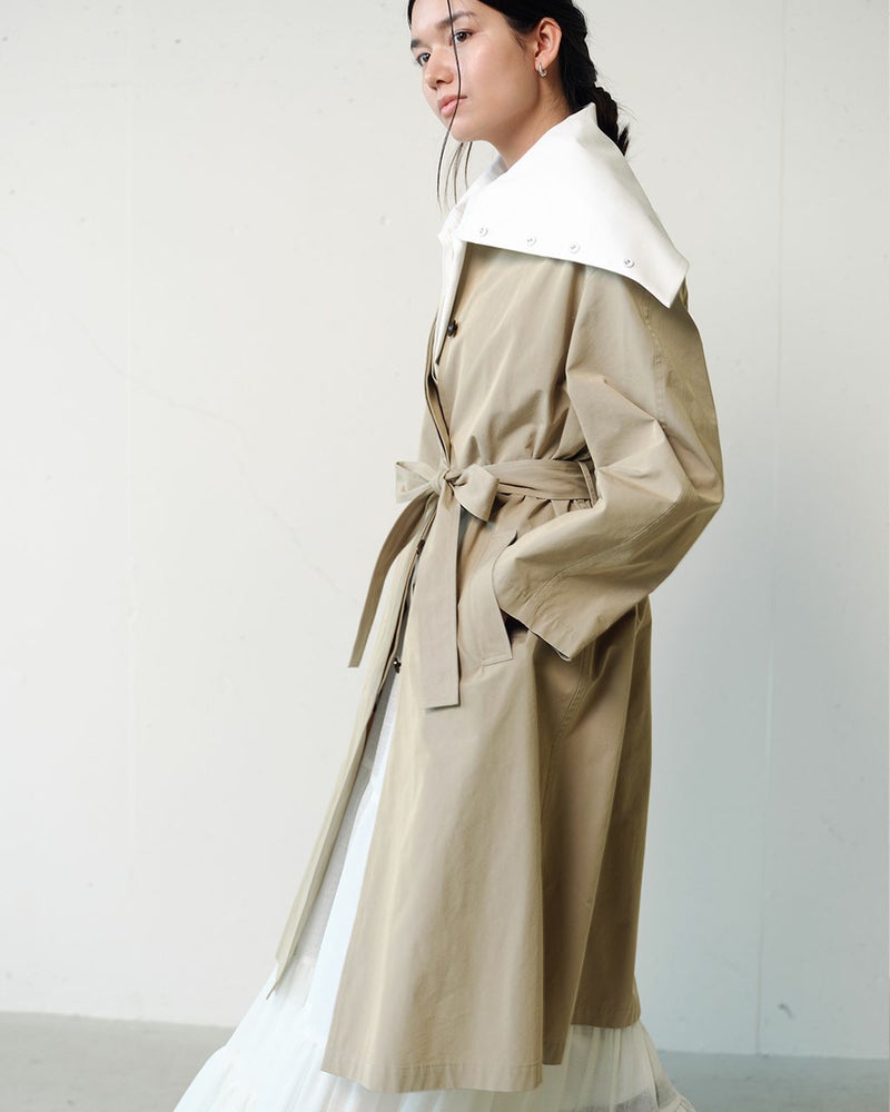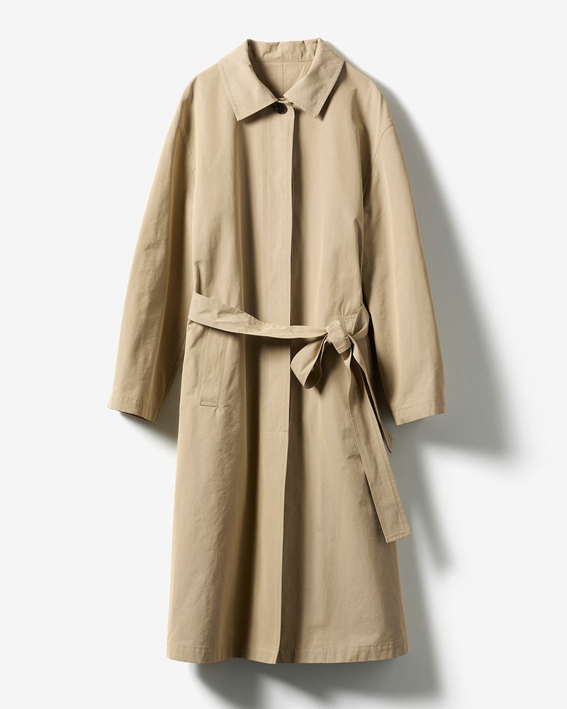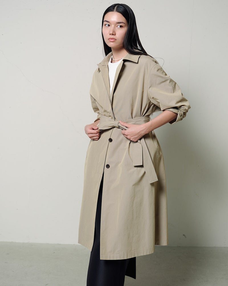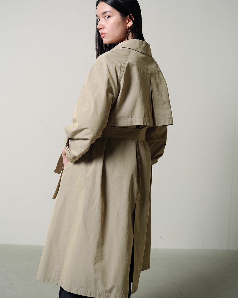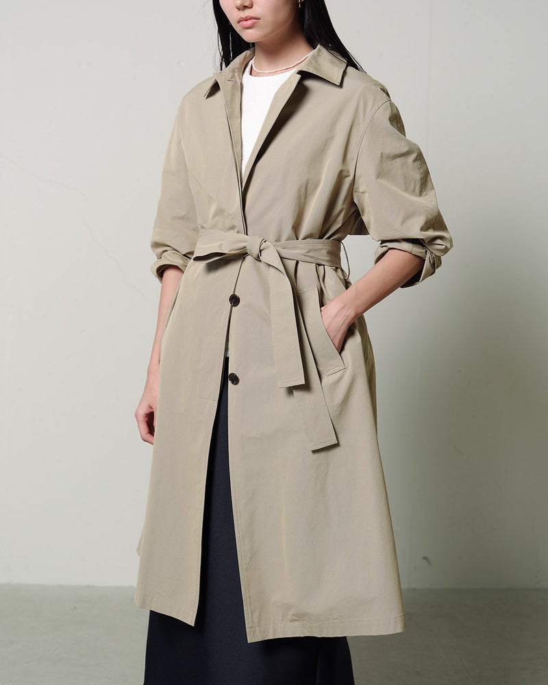 軽さを極めたナイロンコットンのイタリア製シャンブレー生地を、レディライクなシングルトレンチに仕立てました。フロントはステンカラーのようなシングルボタン、背中はトレンチならではの風除け仕様。さっと羽織って風とたわむれるように着こなせば、凛とエレガントなたたずまいに。ウエストマークできる共布ベルト付き。